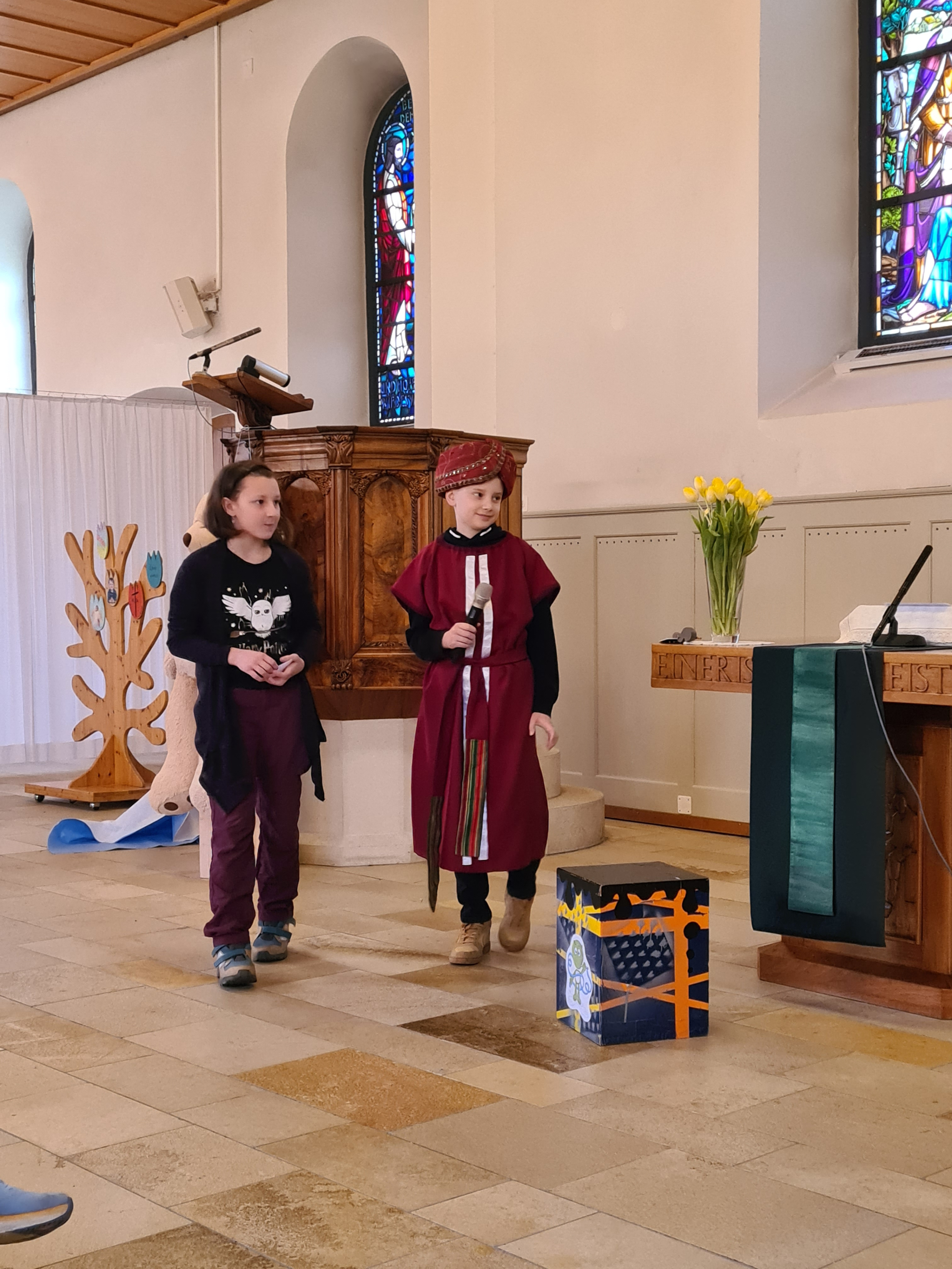 Bereits am Samstag hörte man fröhliche Kinderstimmen aus der Beringer Kirche. Die Kinder waren fleissig am Texte aufsagen, nach einer kurzen Mikrofon-Einführung auch verstärkt. Die angekündigte Stunde brauchten wir gar nicht, das Theater sass!