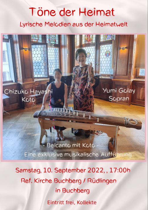 Zwei Welten treffen in diesem Konzert aufeinander: Die Welt des Belcanto und die Welt der traditionellen japanischen Musik mit dem alten Instrument Koto, eine mit 13 Saiten bespannte Wölbbrettzither, welche aus dem 7. Jahrhundert stammt.