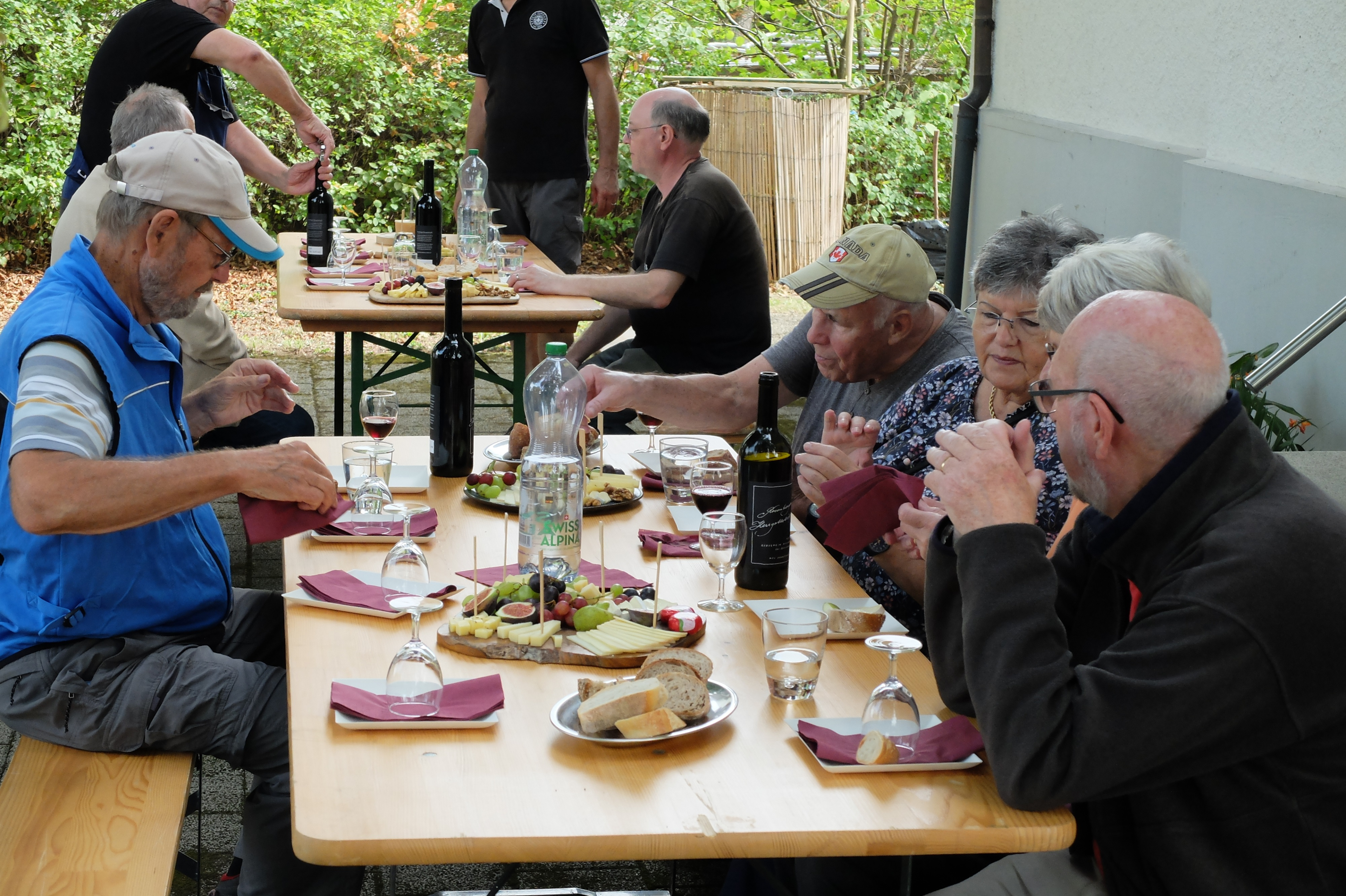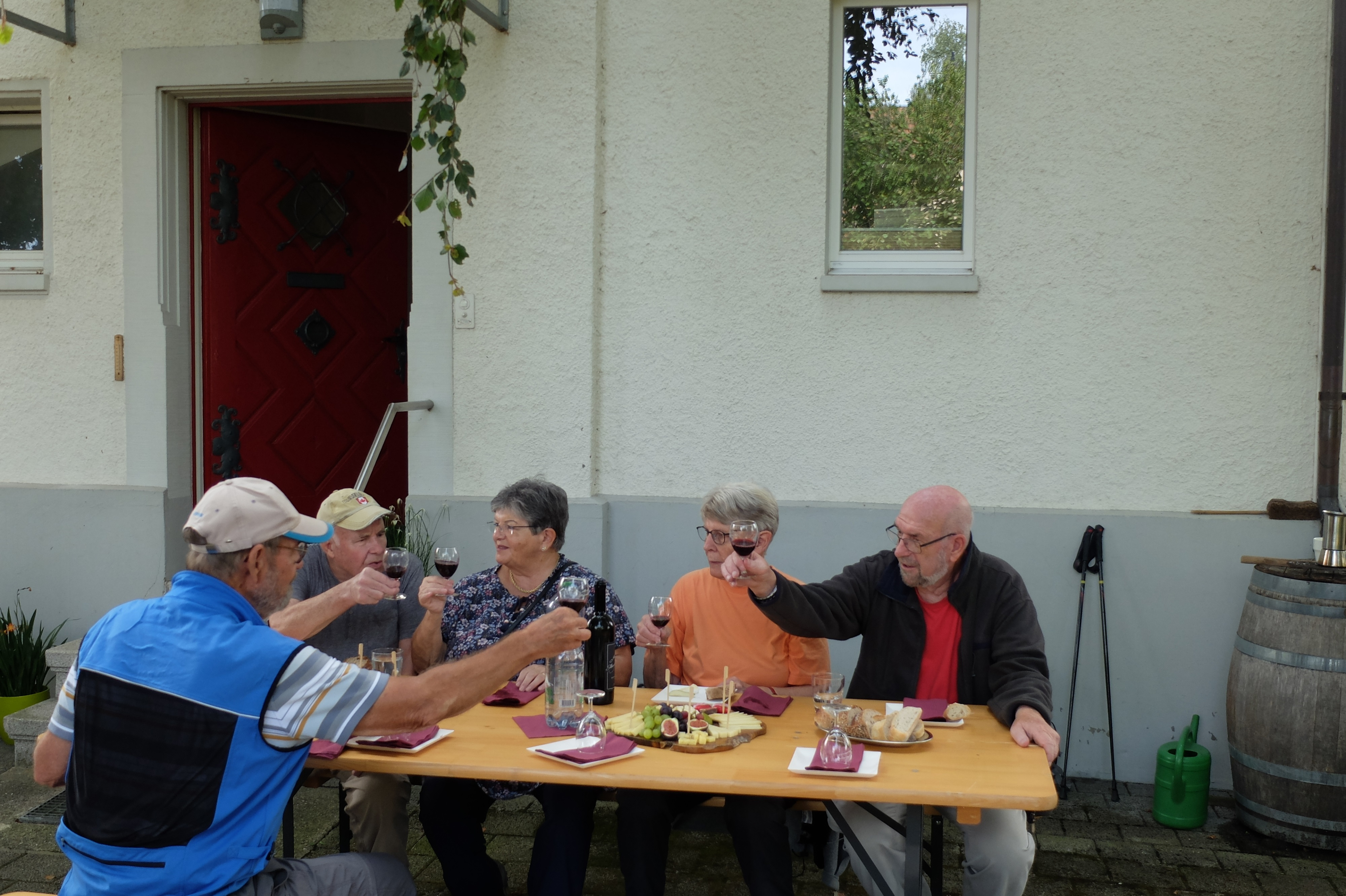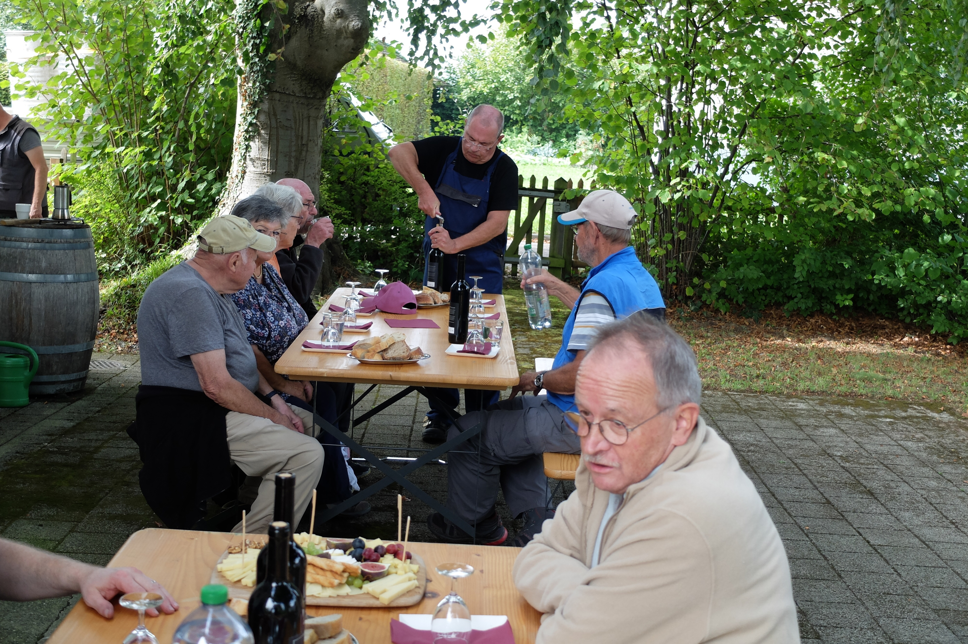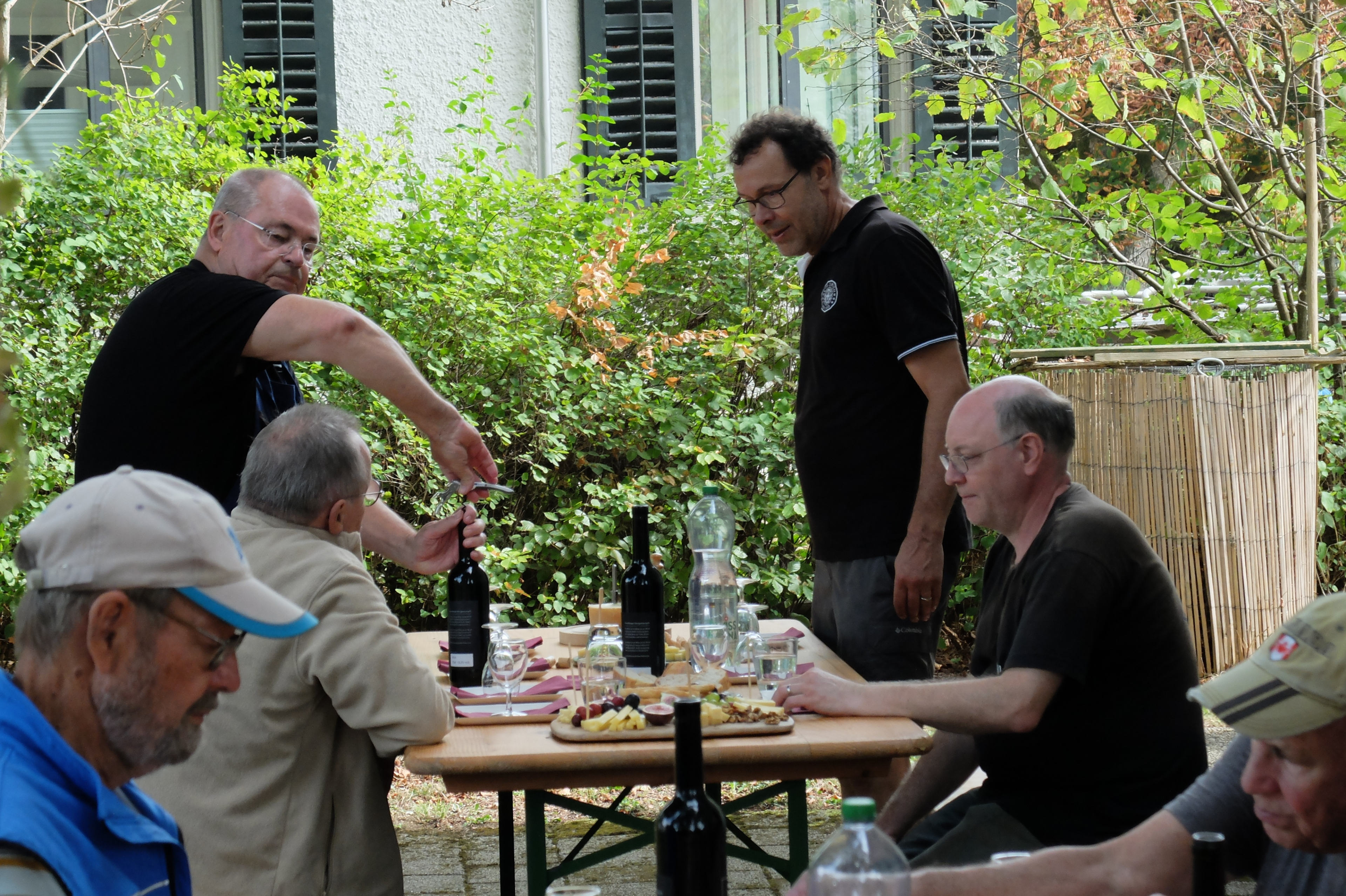 Zwei Stunden später waren die fleissigen Rebleute bereits wieder unterwegs, diesmal zum eigenen Rebberg. Auch der Rosenberg war anfänglich noch etwas in den vom Rhein heraufsteigenden Nebel gehüllt, aber bald zeigten sich die ersten Sonnenstrahlen. Es war mit den angenehm milden Temperaturen einfach ein perfektes Wümmet-Wetter an diesem Samstag vor Bettag. Just am Mittag war die reiche Ernte in der Tonne. Im Schatten der mächtigen Buchen im Pfarrgarten setzte man sich zu Tisch, konnte mit dem vorjährigen Wein anstossen und genoss die reichhaltigen, feinen Käseplatten. Zeit auch, um beim geselligen Beisammensein das eine oder andere auszutauschen.