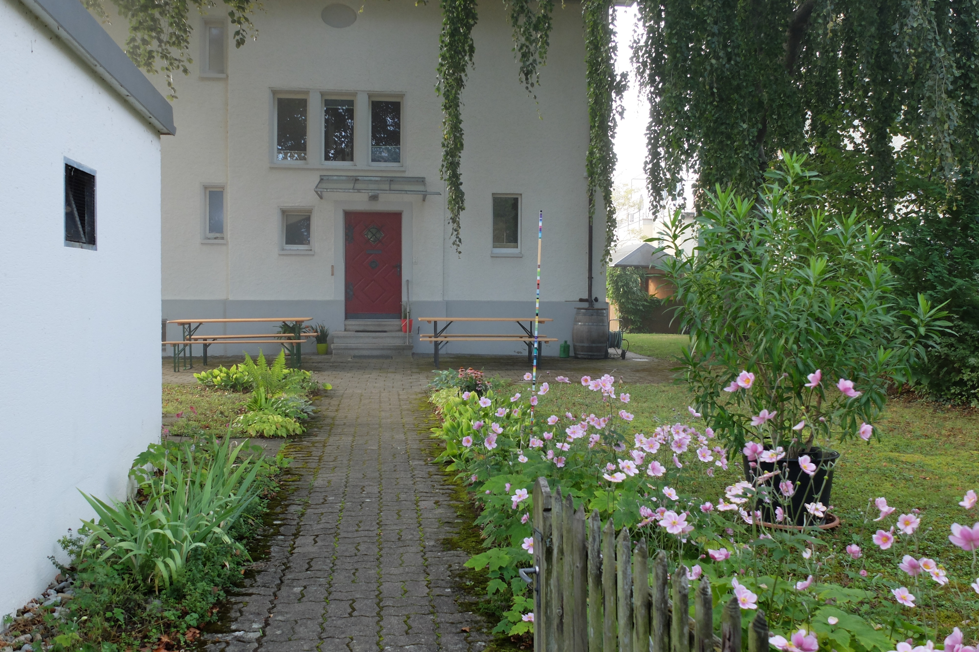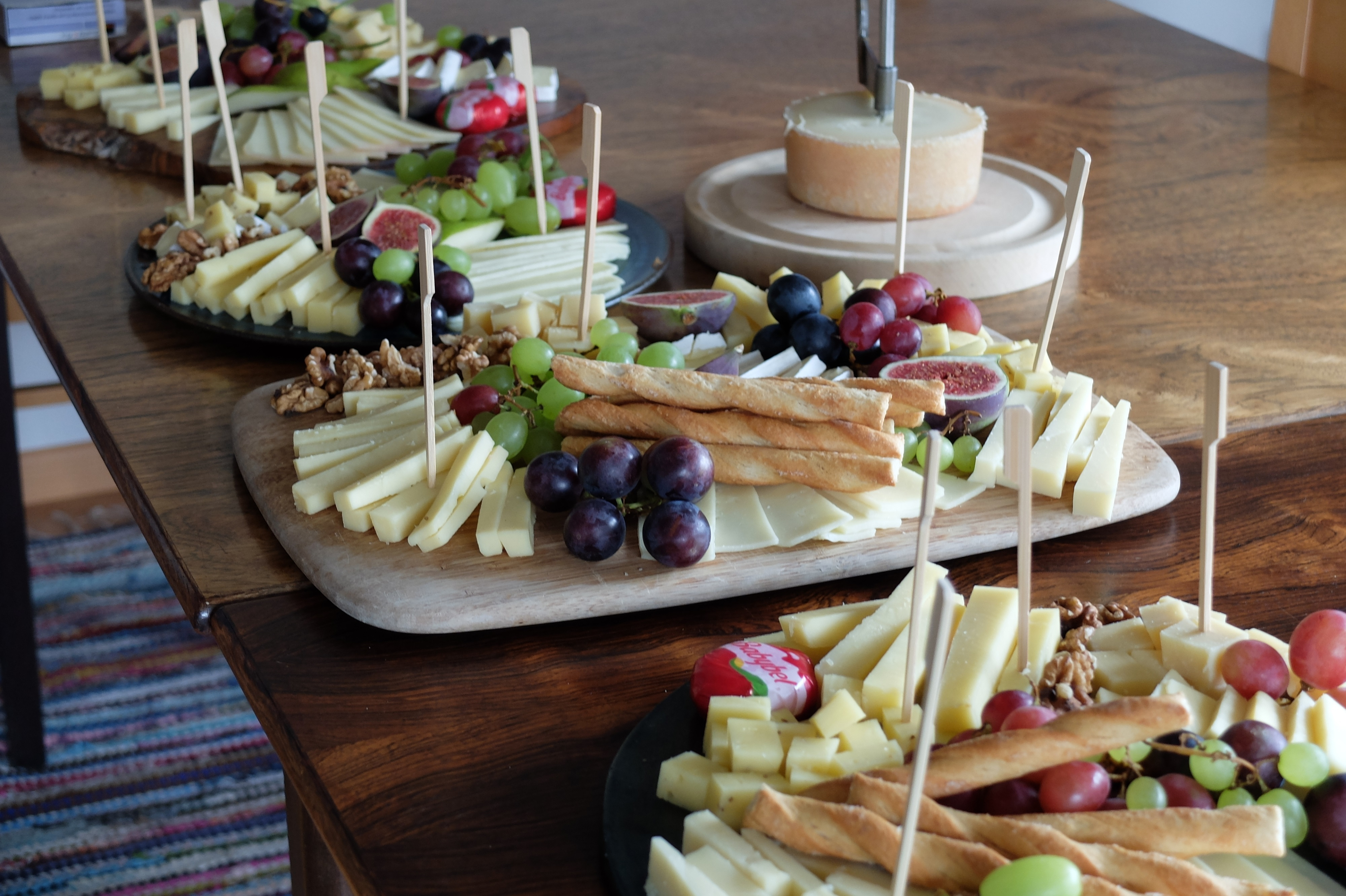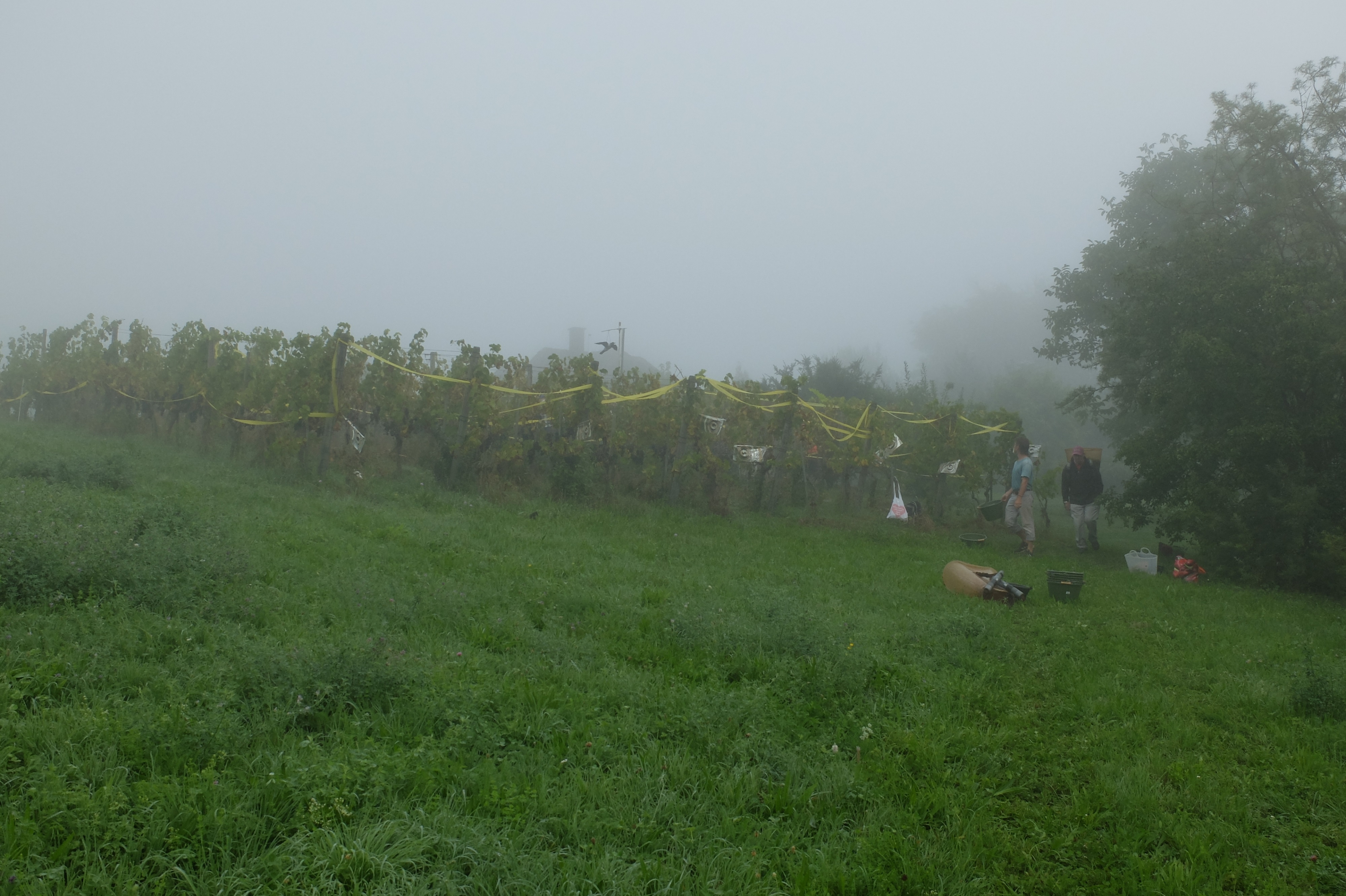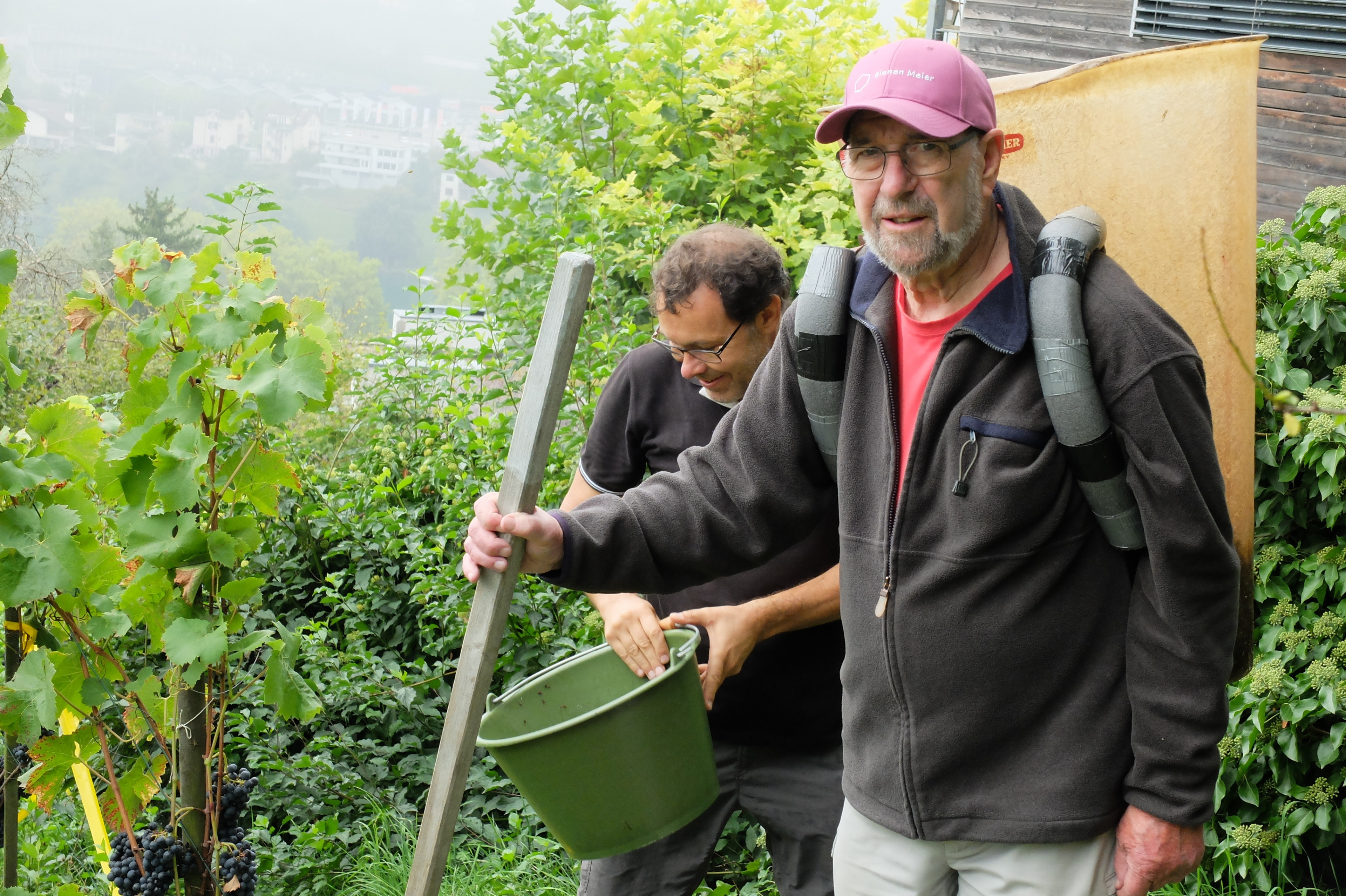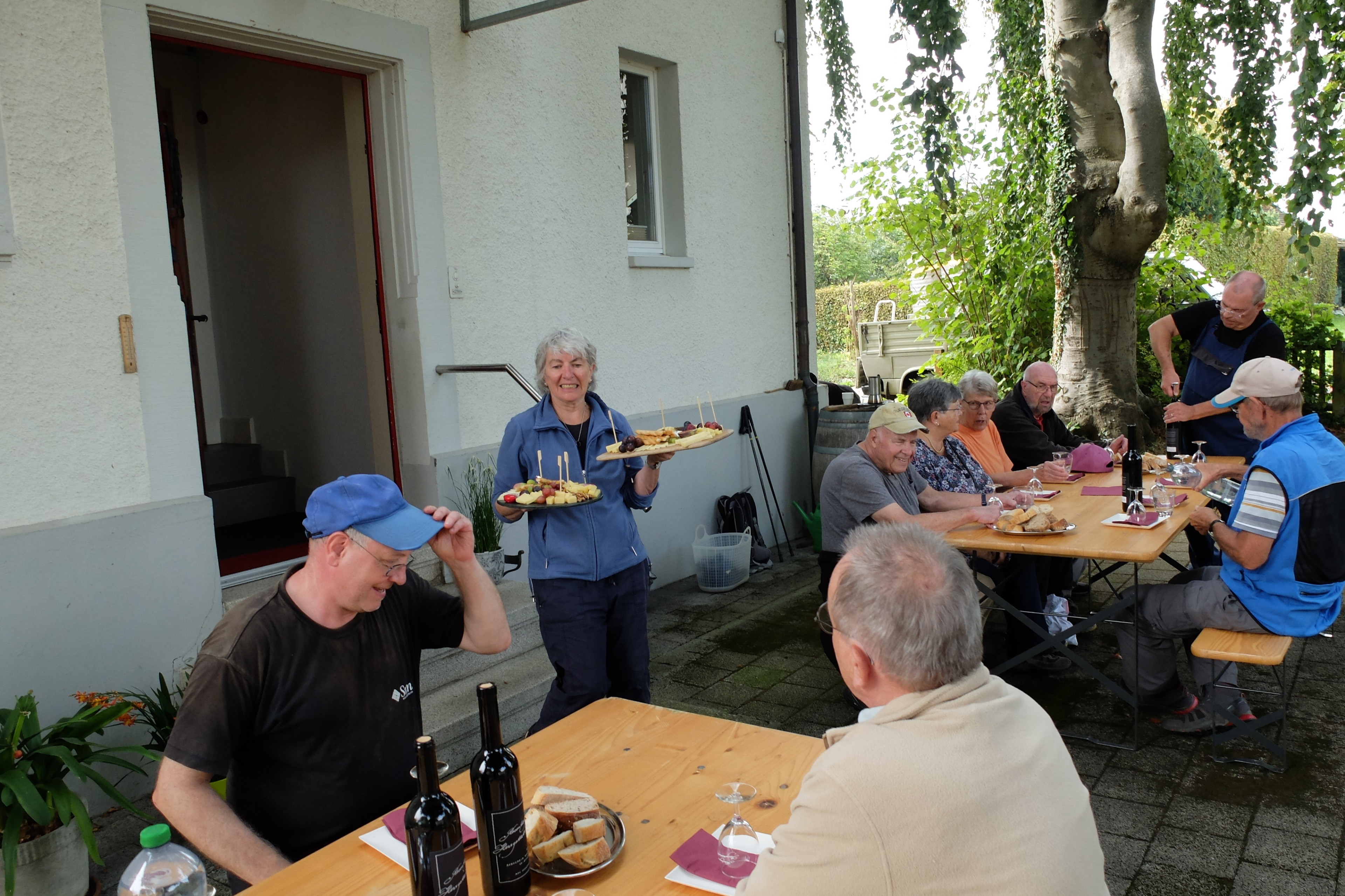 Zwei Stunden später waren die fleissigen Rebleute bereits wieder unterwegs, diesmal zum eigenen Rebberg. Auch der Rosenberg war anfänglich noch etwas in den vom Rhein heraufsteigenden Nebel gehüllt, aber bald zeigten sich die ersten Sonnenstrahlen. Es war mit den angenehm milden Temperaturen einfach ein perfektes Wümmet-Wetter an diesem Samstag vor Bettag. Just am Mittag war die reiche Ernte in der Tonne. Im Schatten der mächtigen Buchen im Pfarrgarten setzte man sich zu Tisch, konnte mit dem vorjährigen Wein anstossen und genoss die reichhaltigen, feinen Käseplatten. Zeit auch, um beim geselligen Beisammensein das eine oder andere auszutauschen.
