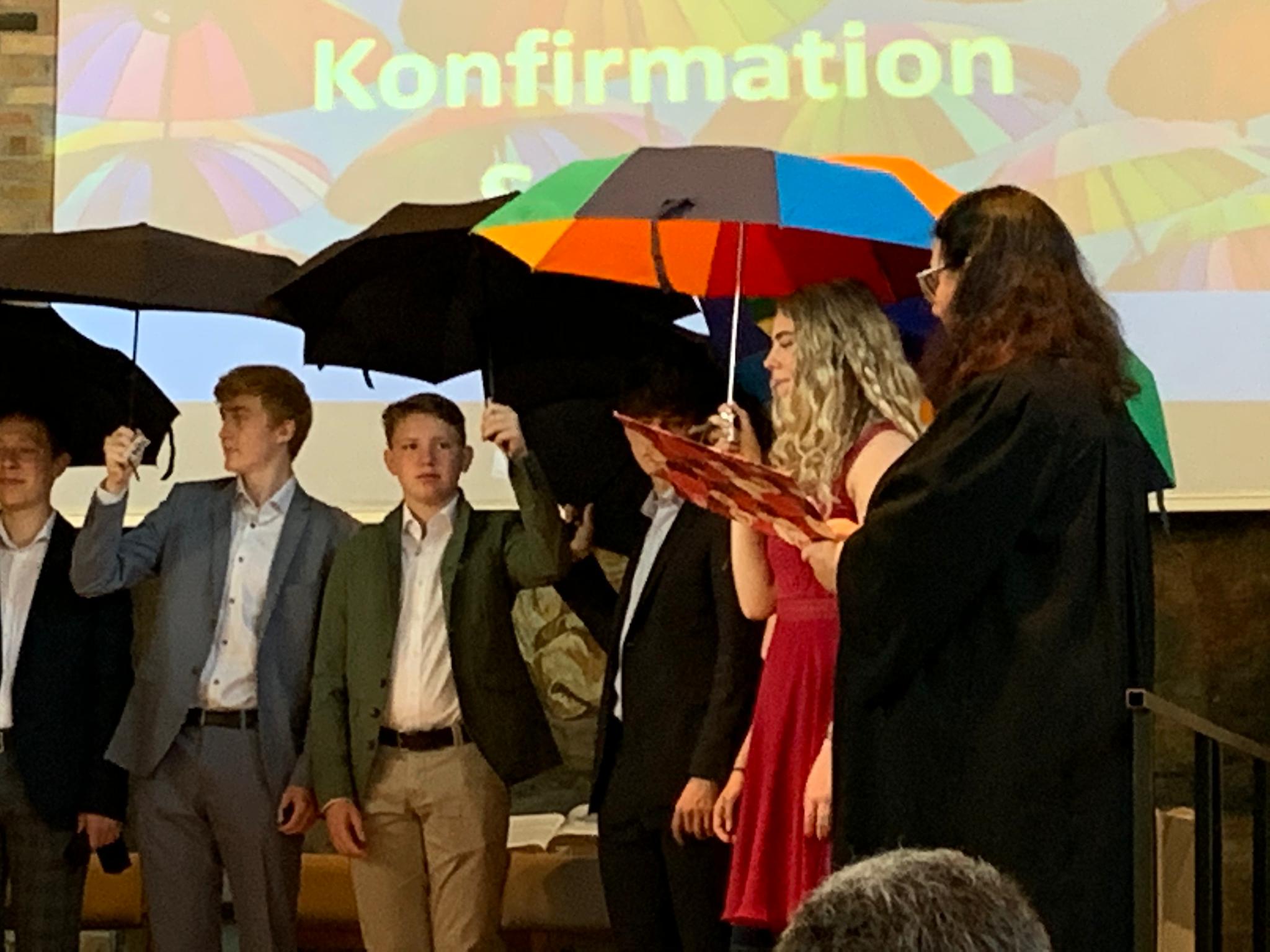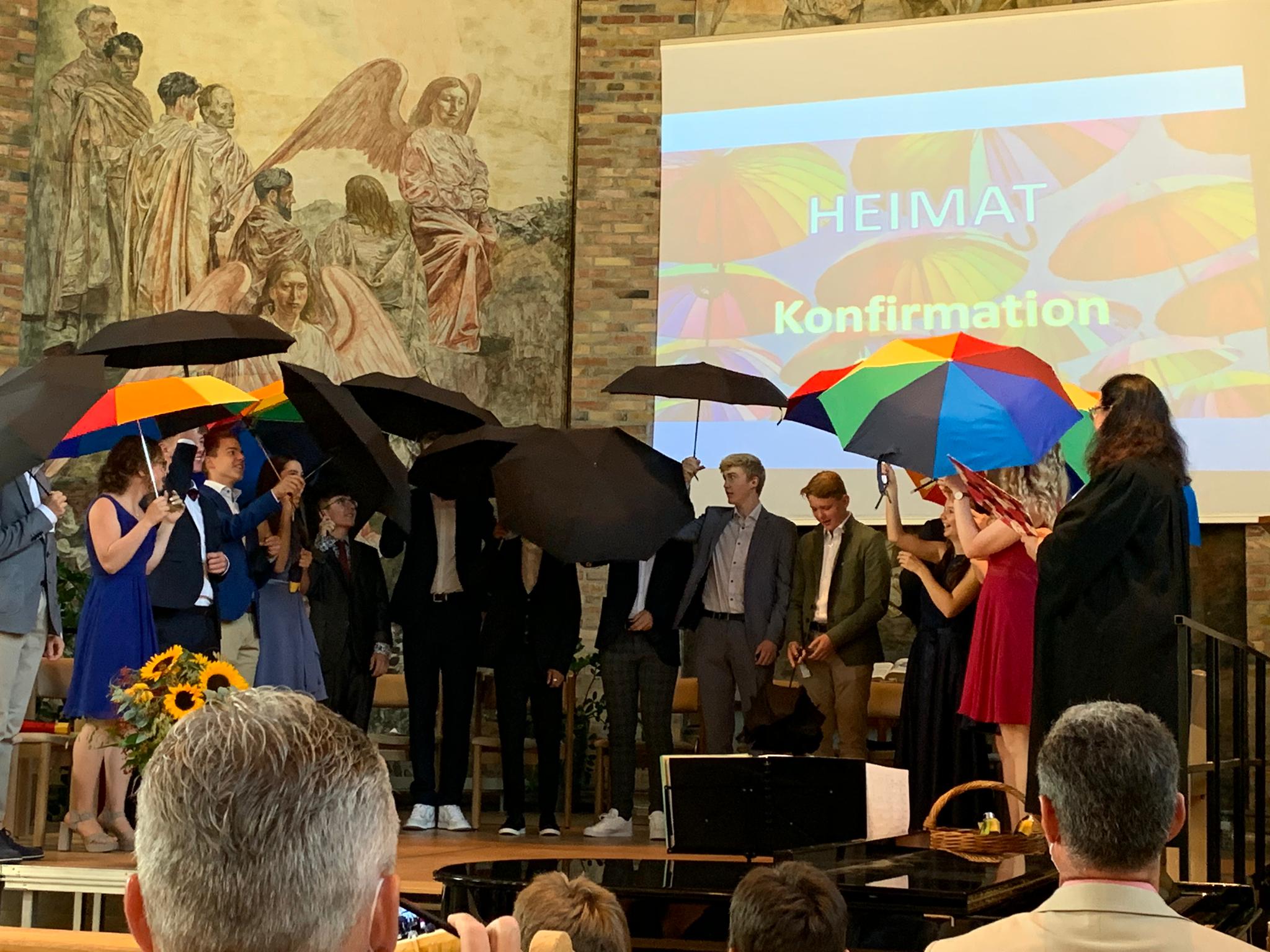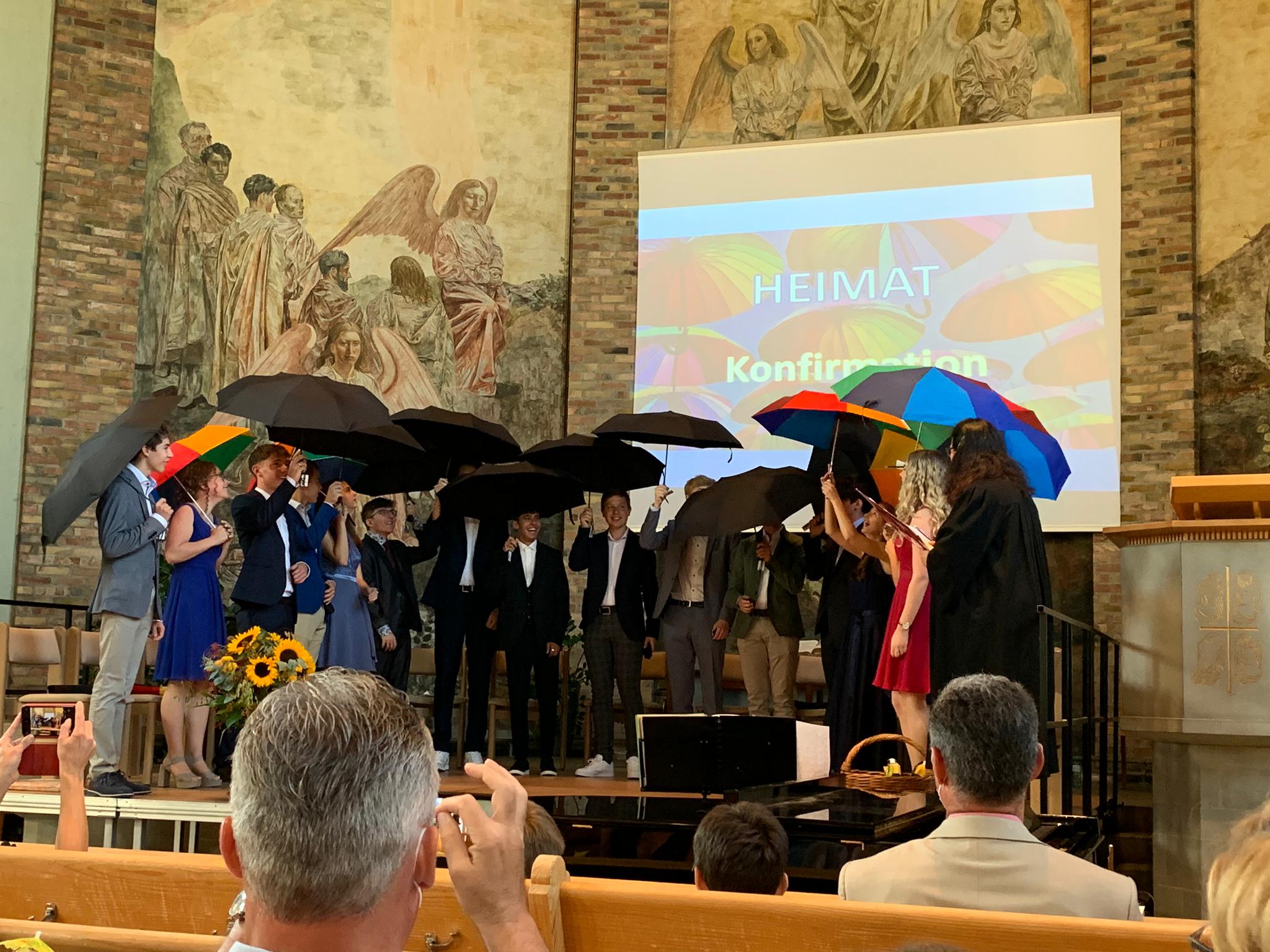 Nachdem jeder junge Mensch ein Bibelwort empfangen hatte und persönlich gesegnet wurde, erhielten alle gemeinsam den Segen "unter Gottes Schirm". Hansueli Scheck, Mesmer und Synodaler, formulierte persönliche Begrüssungsworte für die Neu-Konfirmierten.