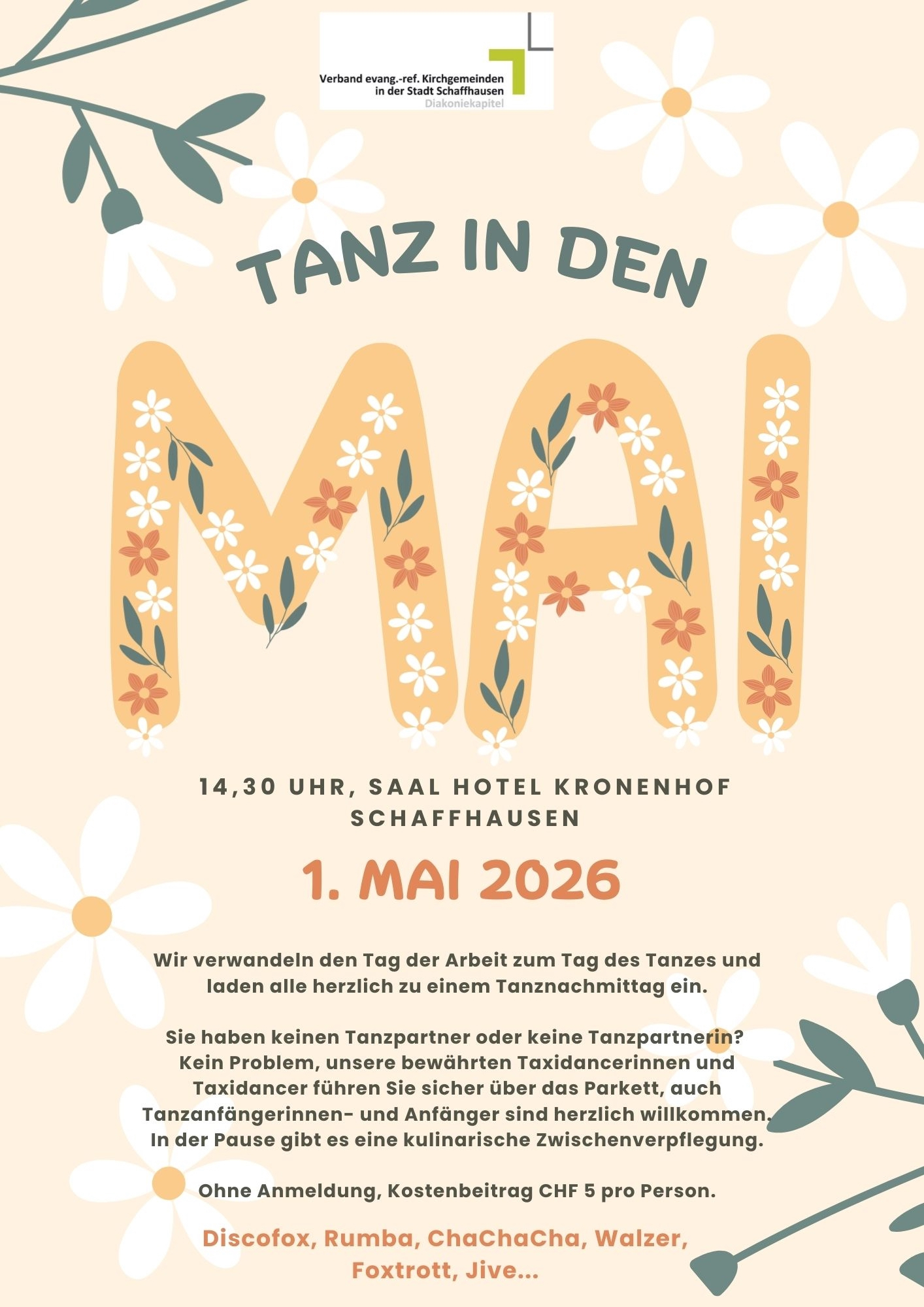 Tanzen Sie mit uns in den Mai! Wir verwandeln den Tag der Arbeit zum Tag des Tanzes und laden alle herzlich zu einem Tanznachmittag ein. Discofox, Rumba, Chachacha oder Jife, die Tanzstile lassen keine Wünsche offen. Sie haben keinen Tanzpartner oder keine Tanzpartnerin? Kein Problem, unsere bewährten Taxidancerinnen und Taxidancer führen Sie sicher über das Parkett, auch Tanzanfängerinnen- und Anfänger sind herzlich willkommen. In der Pause gibt es eine kulinarische Zwischenverpflegung.