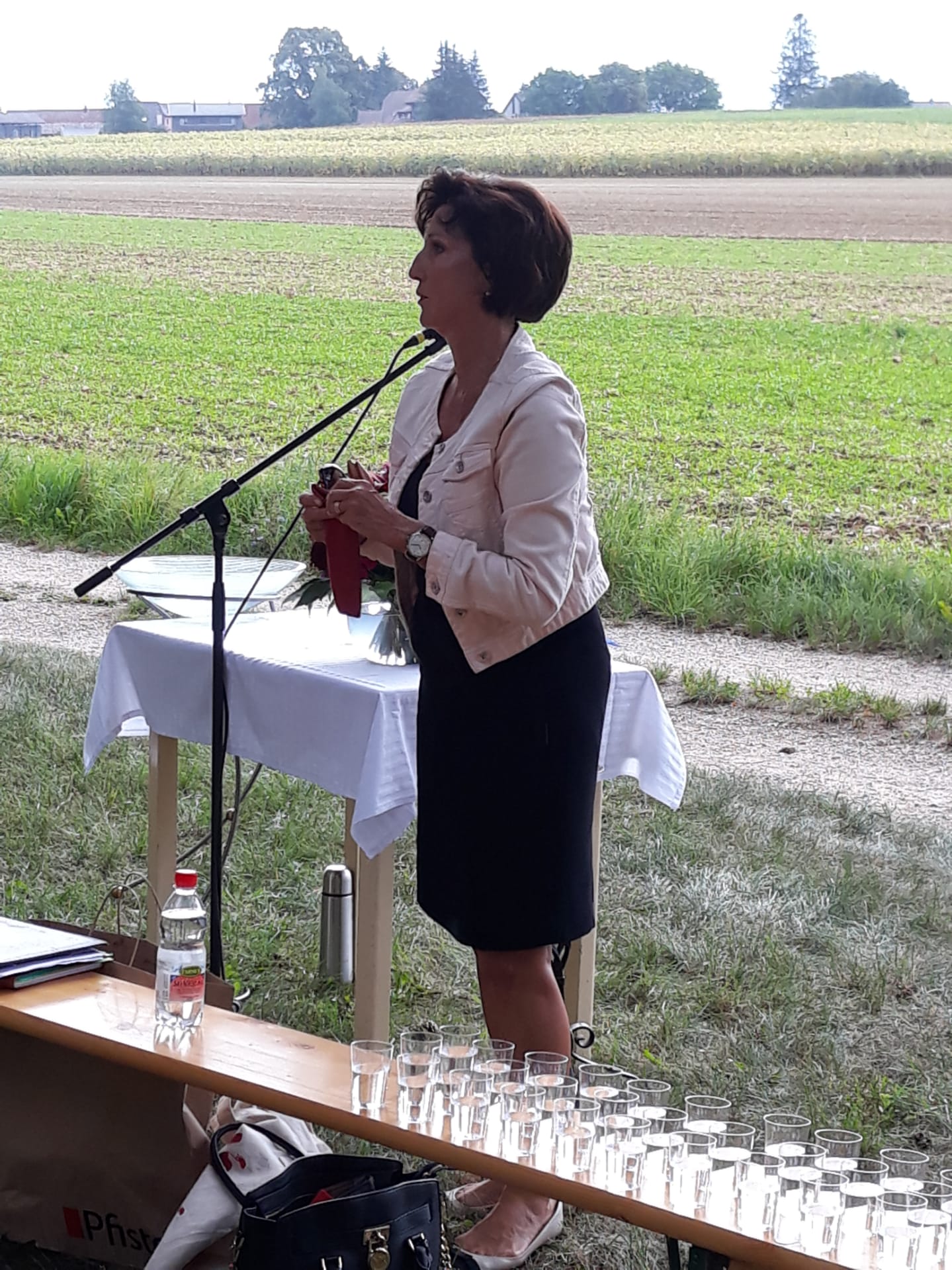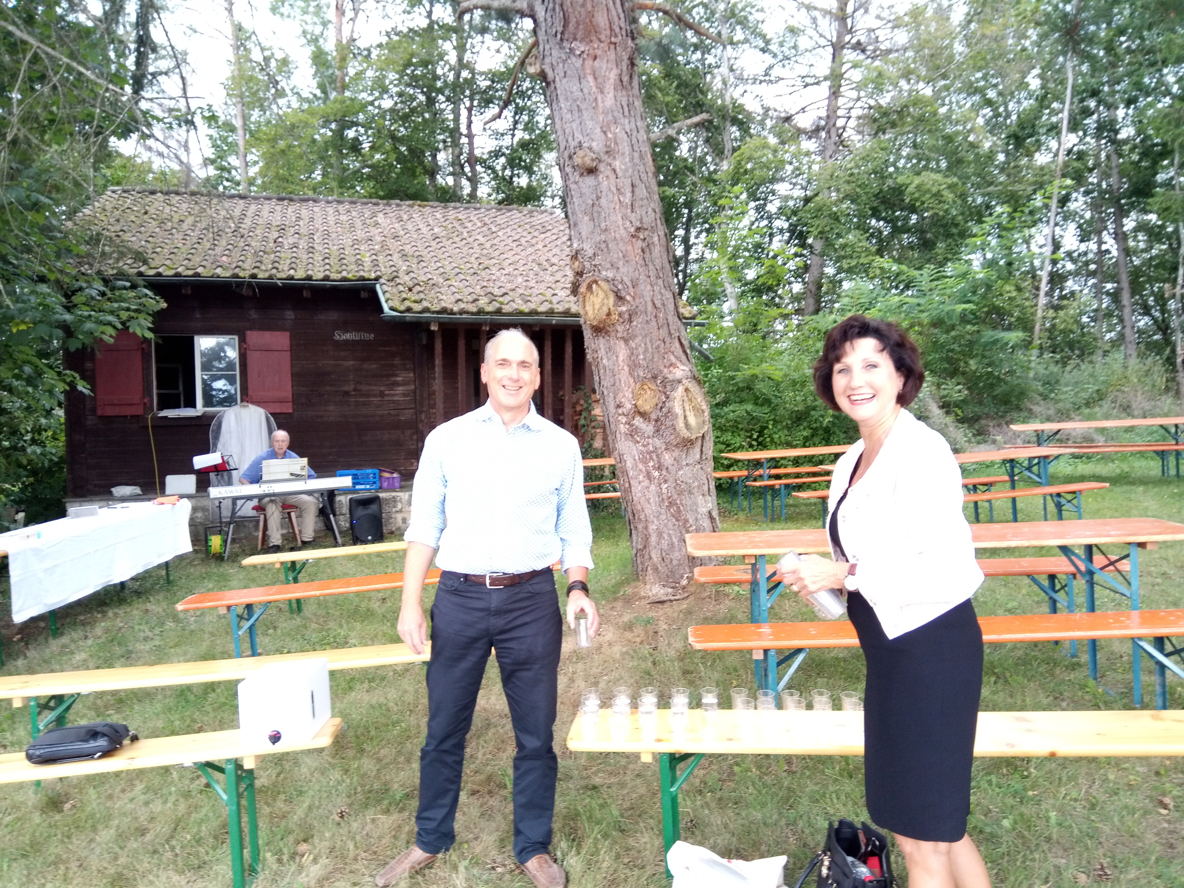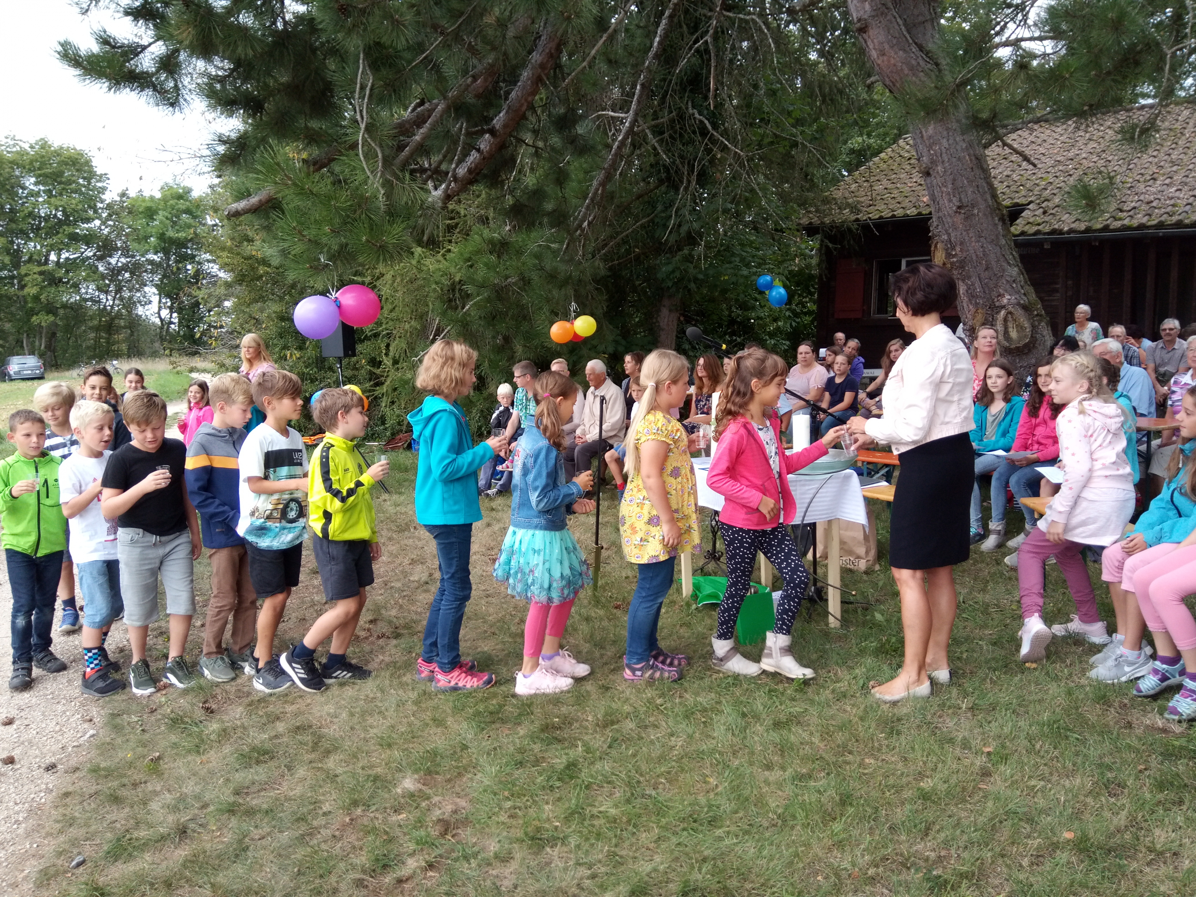 Bei der Waldhütte „Hohliflue“ in Büttenhardt hatten sich gegen 100 Gottesdienstbesucher und –besucherinnen zwischen 1 und 98 Jahren versammelt. Die Kinder des Religionsunterrichts der 3. und 4. Klasse brachten das Taufwasser für Loris. Im Taufgebet baten sie Gott um alles für Loris, was Kinder sich für ein glückliches, gelingendes Leben wünschen. Katechetin Conny Gfeller fesselte alle mit ihrer lebendigen Art, als sie die Geschichte von Beppo erzählte. Nach dem Gottesdienst genossen viele noch ein gemeinsames Brätelzmittag. Der Kuchen fand guten Absatz bis fast zur letzten Krume. Nur eine einzige Flasche versagte ihren Dienst: die Heliumflasche, die unsere Dankballone hätte in den Himmel steigen lassen sollen. Sei’s drum: der liebe Gott hört unsere Gebete auch so und wird wohl etwas geschmunzelt haben…