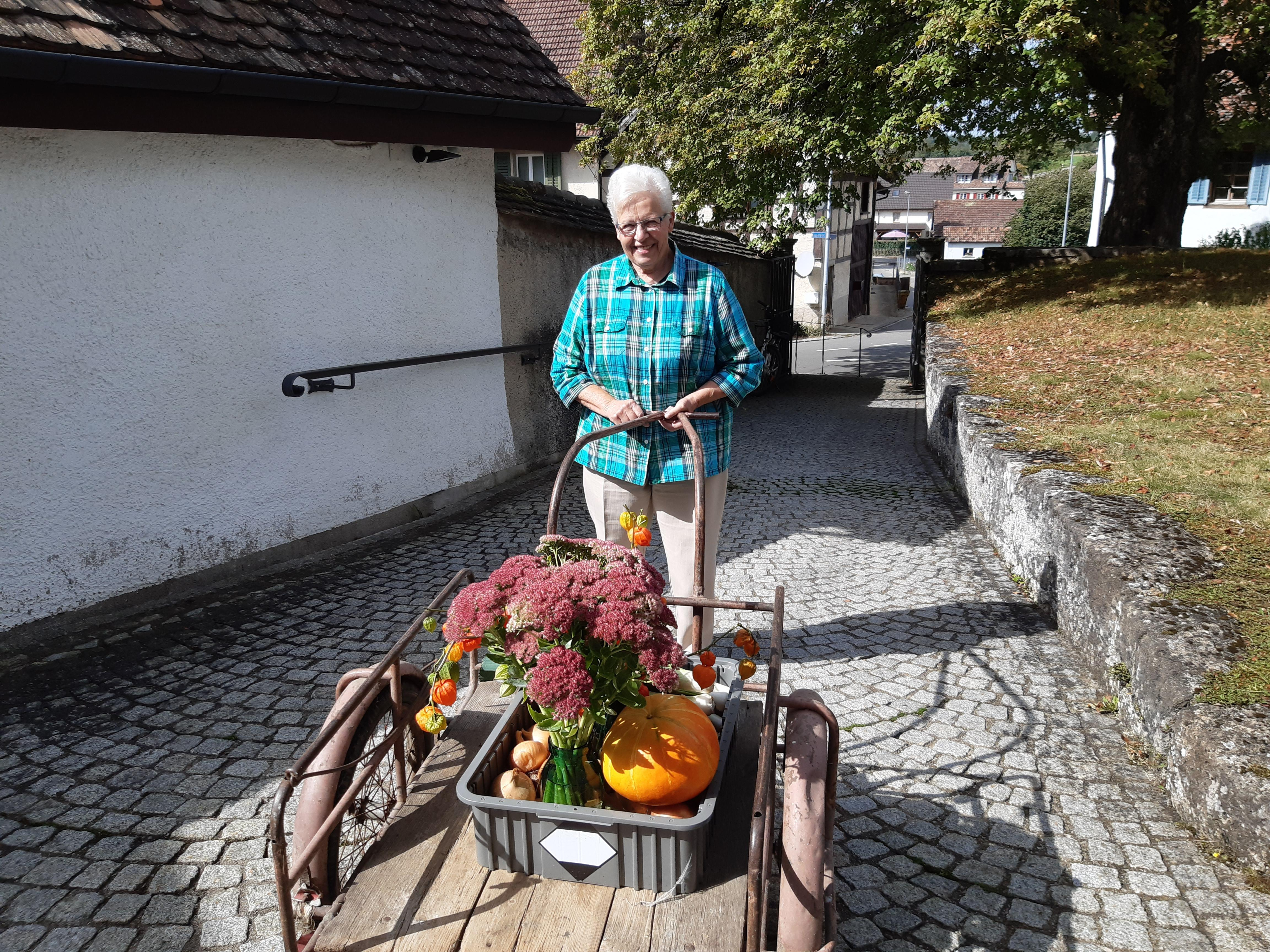 Am Samstag genossen alle, die ihre Erntedankgaben brachten, einen Kaffee unter dem Vordach der Kirche. Die Sonne schien uns auf den Buckel, und wir genossen das Zusammensein.