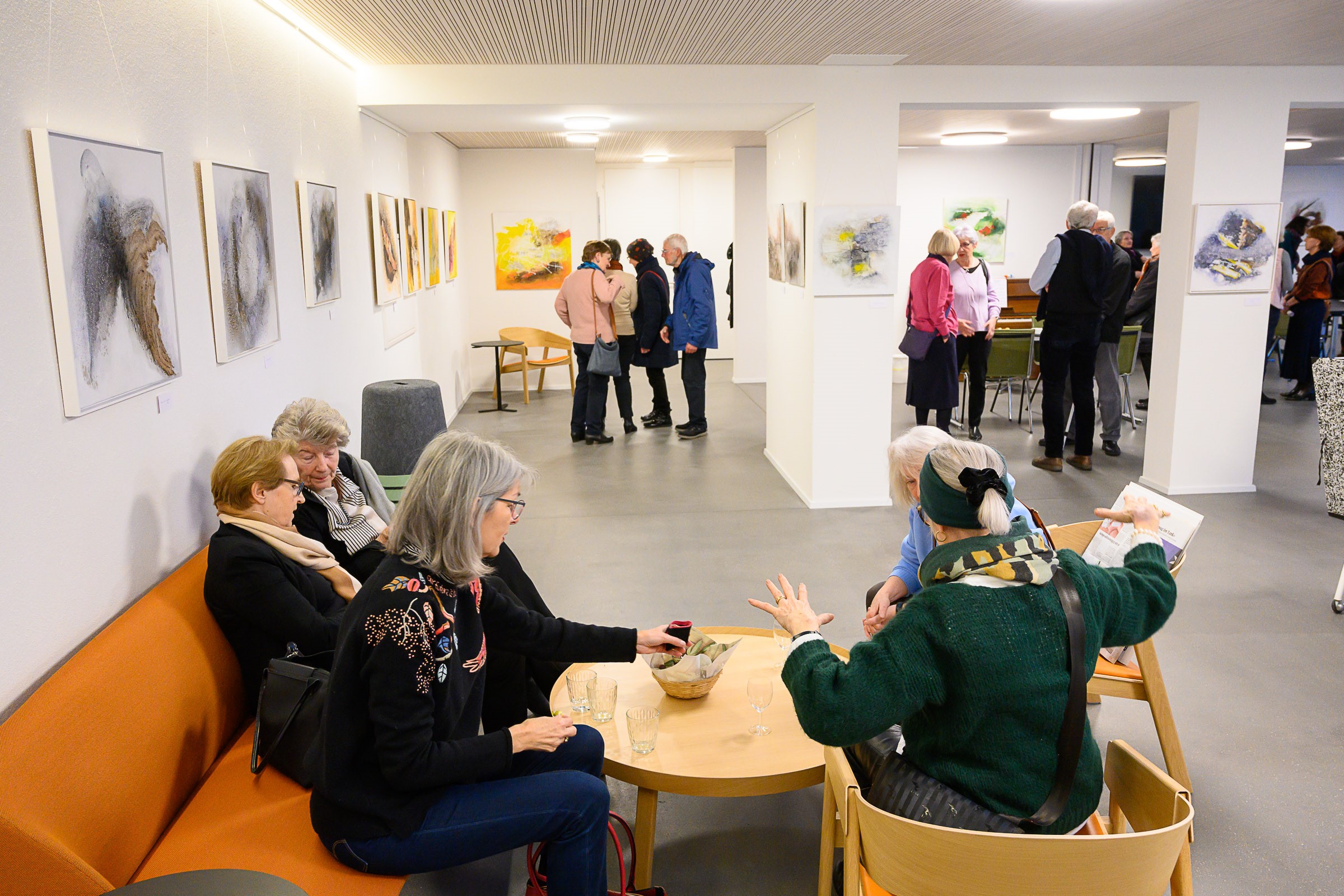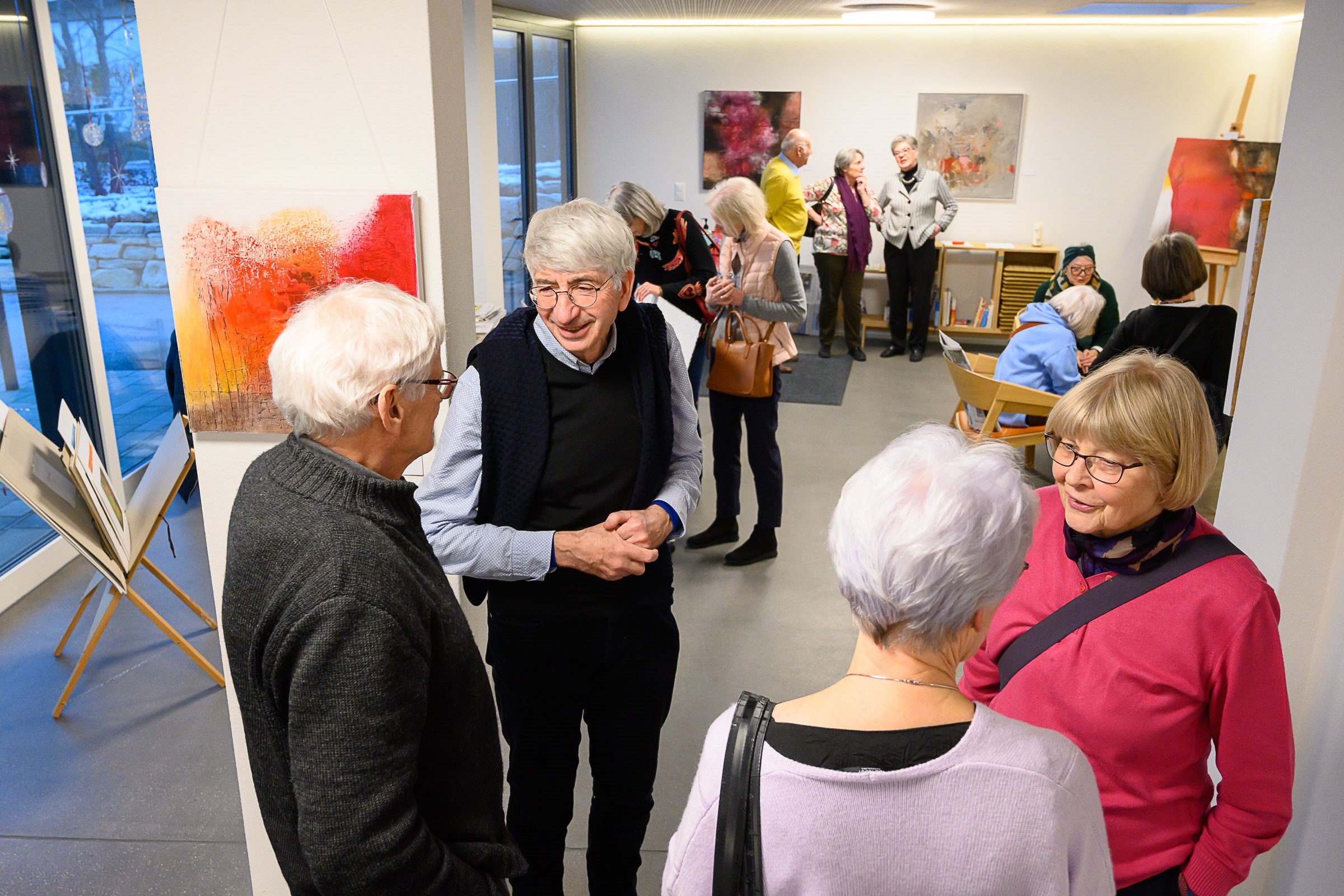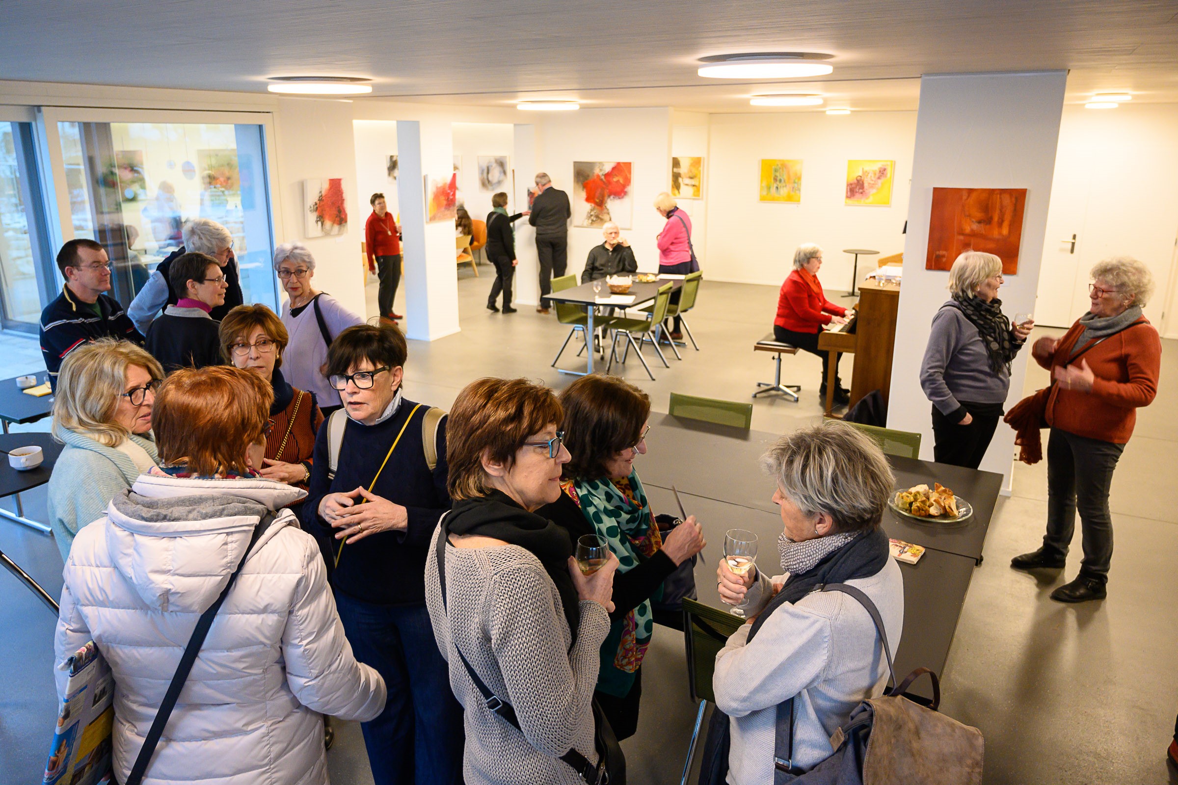 Die Künstlerin Meta Wüthrich von Stetten stellte bis Ende März 2023 einige ihrer Bilder im Pfarrhaussaal in Lohn aus. Ende Januar gab es eine kleine Vernissage mit Musik von Vreni Wipf. Die Bilder und die Besucherinnen und Besucher strahlten um die Wette…
