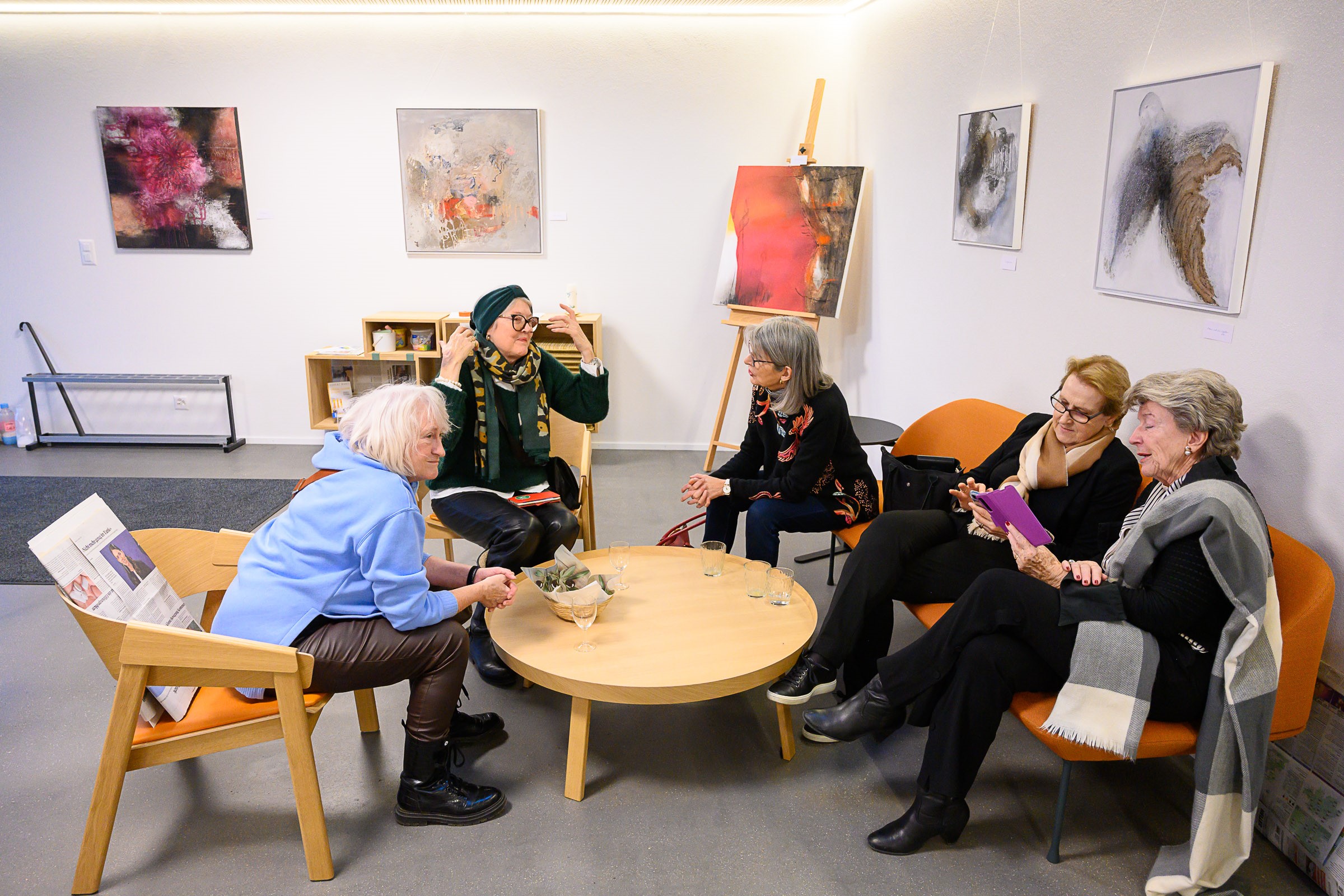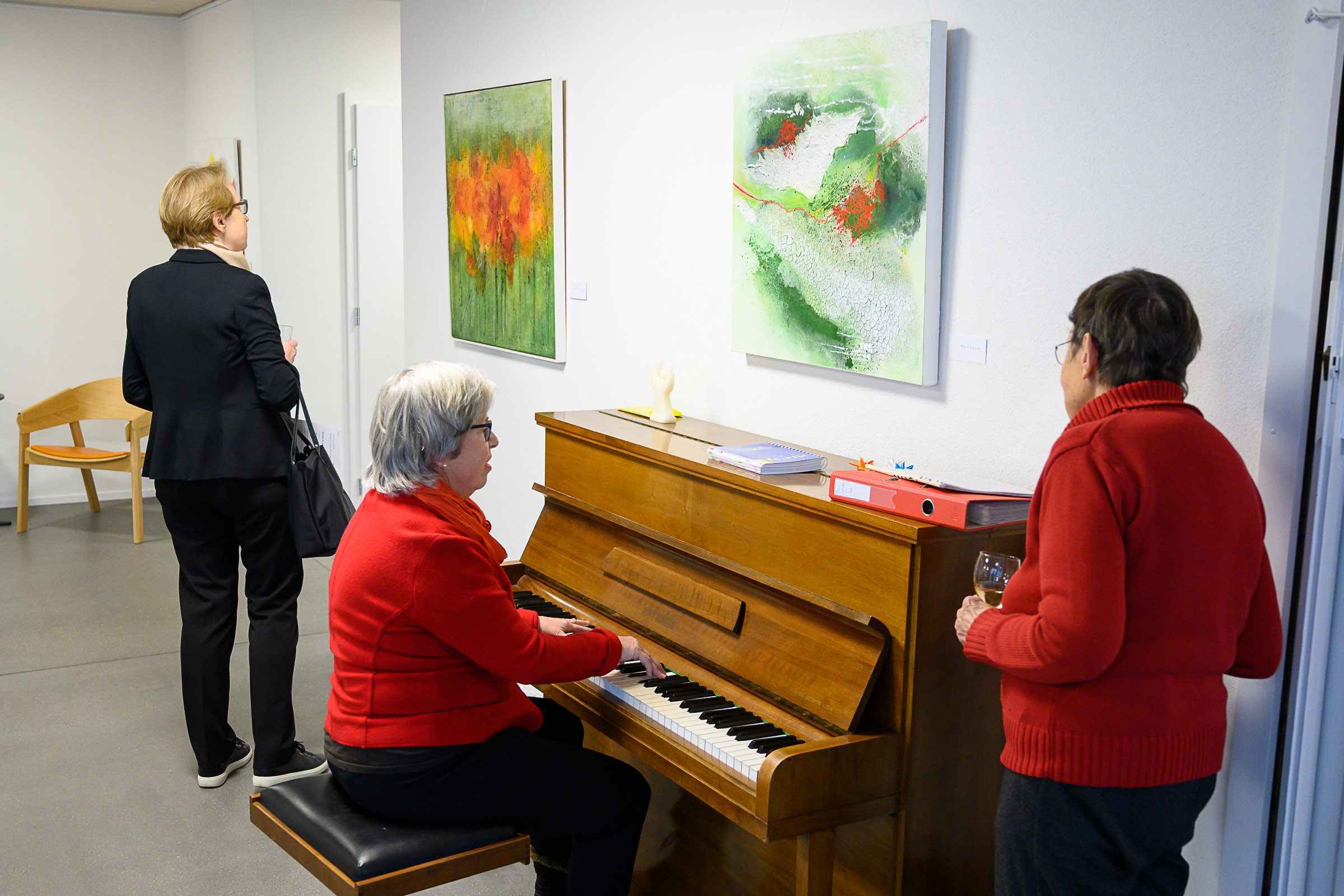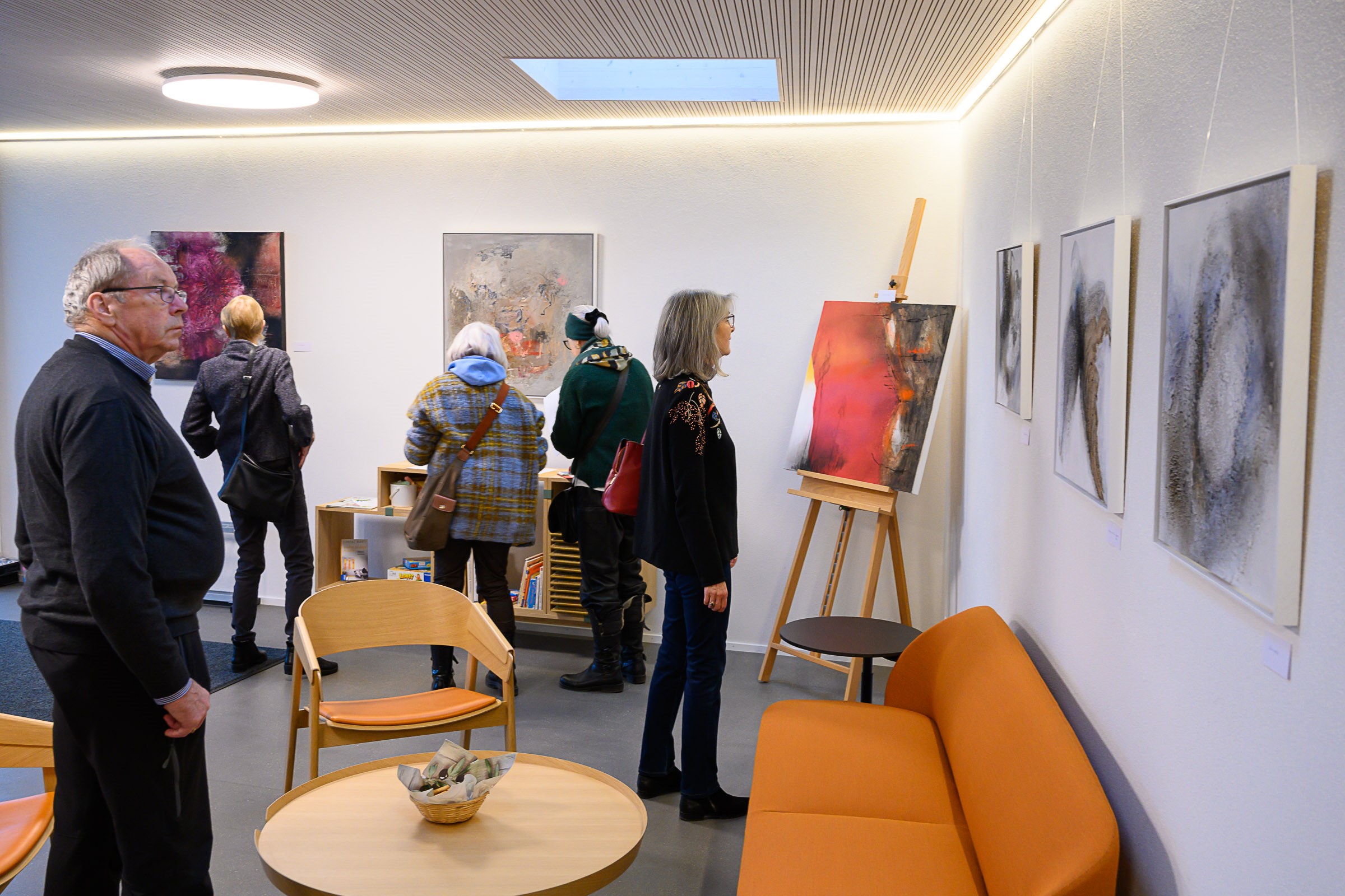Die Künstlerin Meta Wüthrich von Stetten stellte bis Ende März 2023 einige ihrer Bilder im Pfarrhaussaal in Lohn aus. Ende Januar gab es eine kleine Vernissage mit Musik von Vreni Wipf. Die Bilder und die Besucherinnen und Besucher strahlten um die Wette…