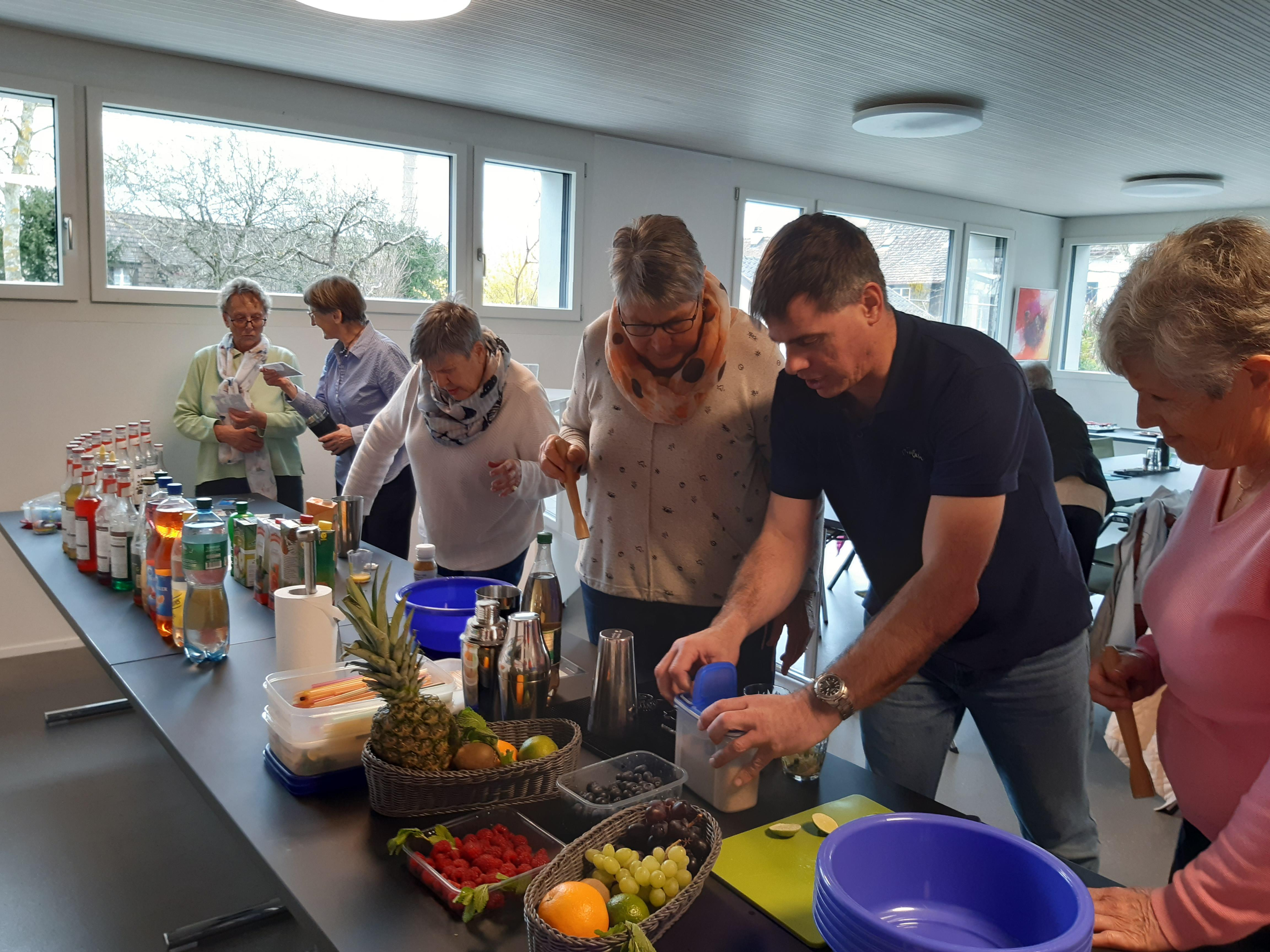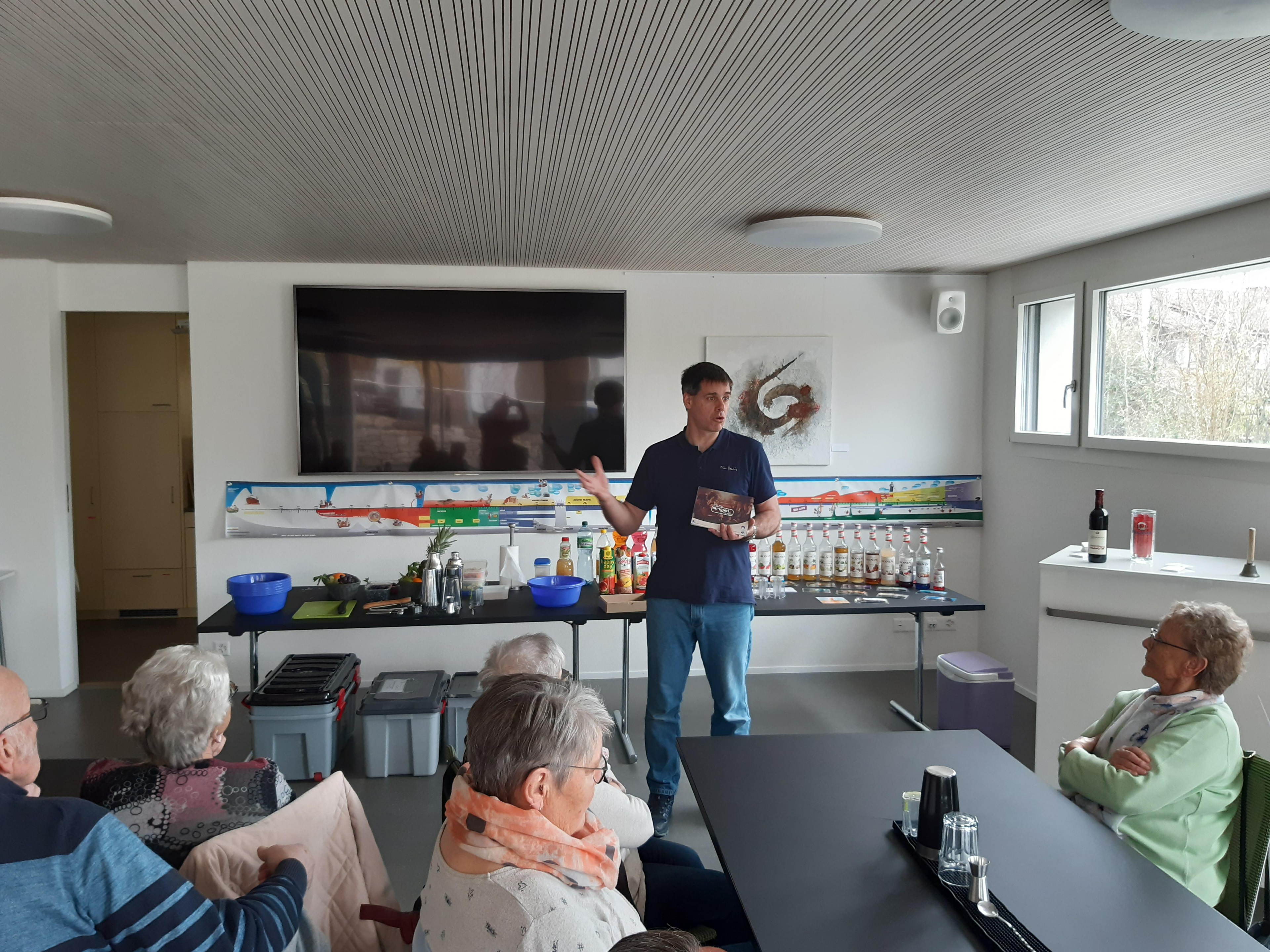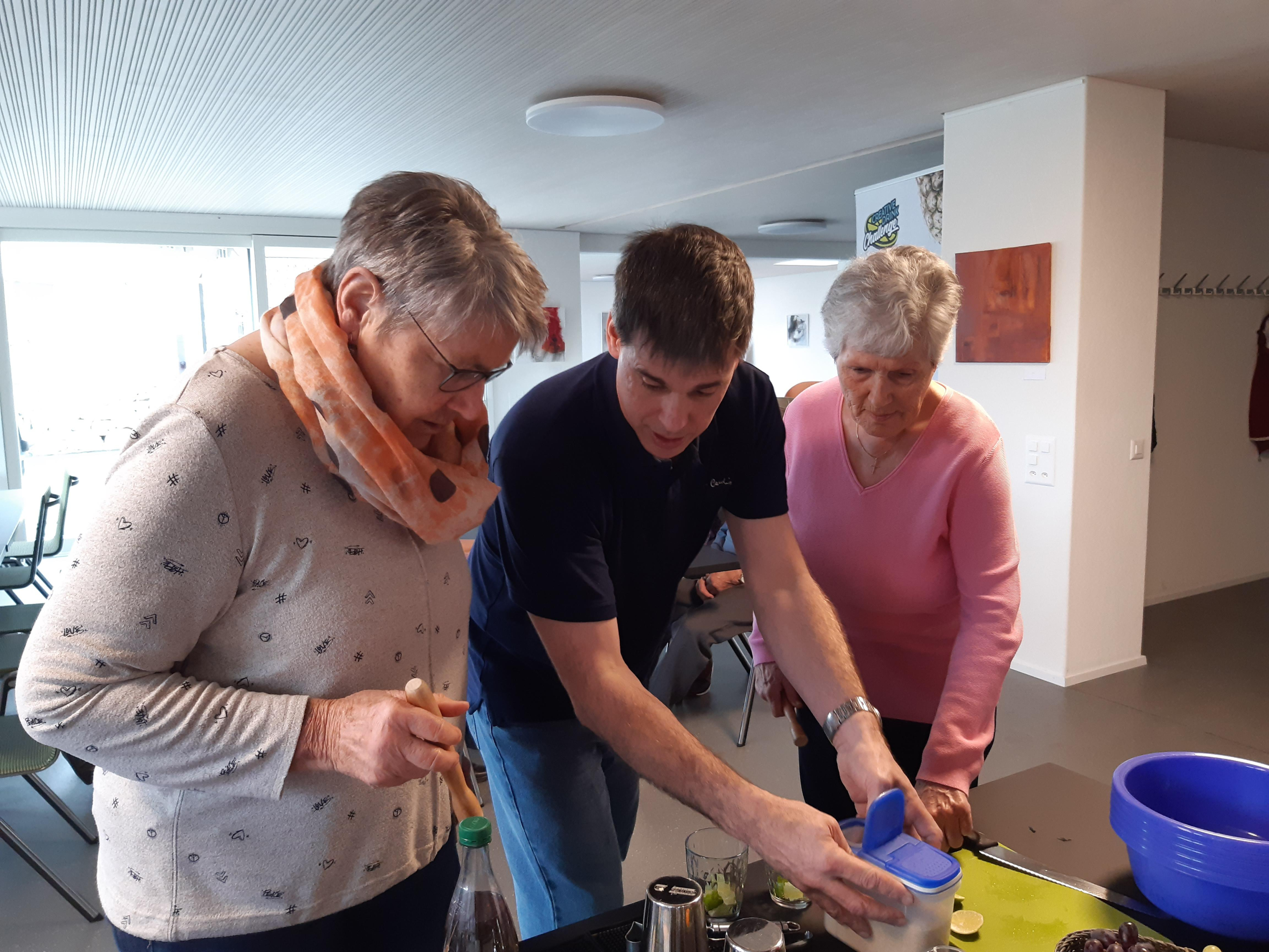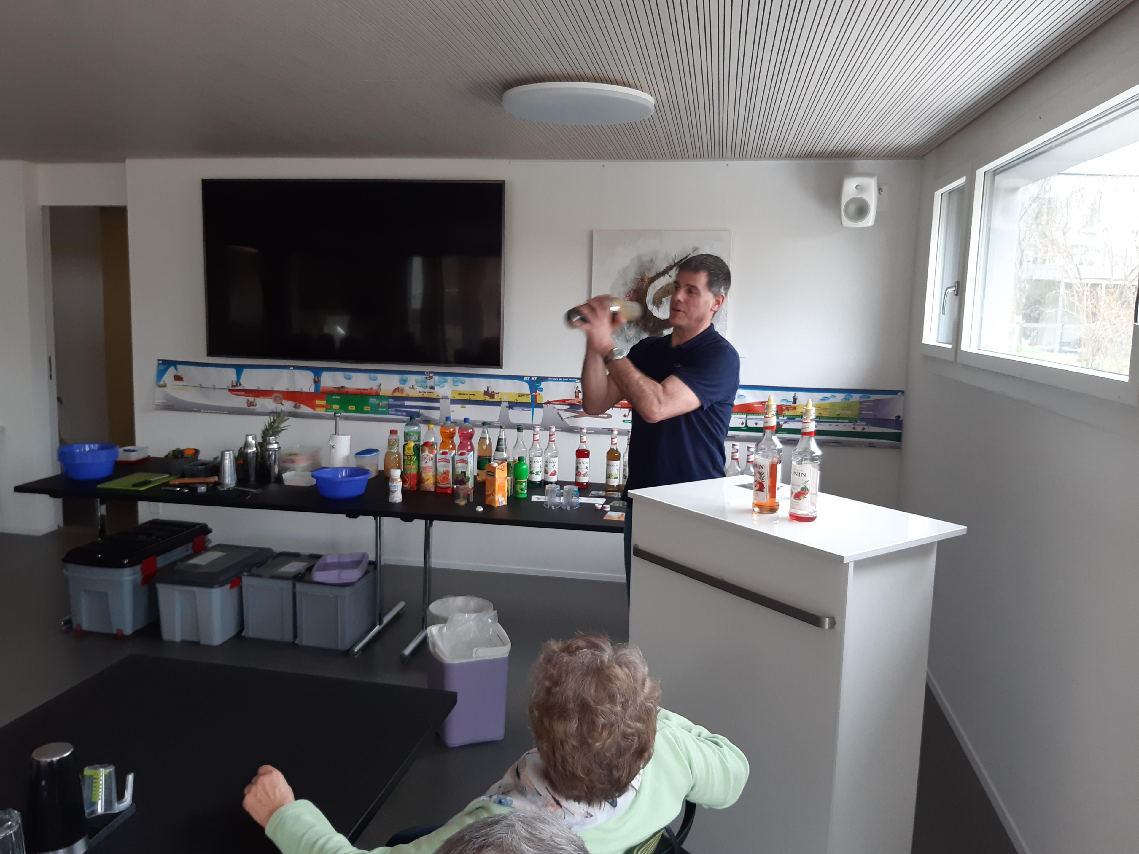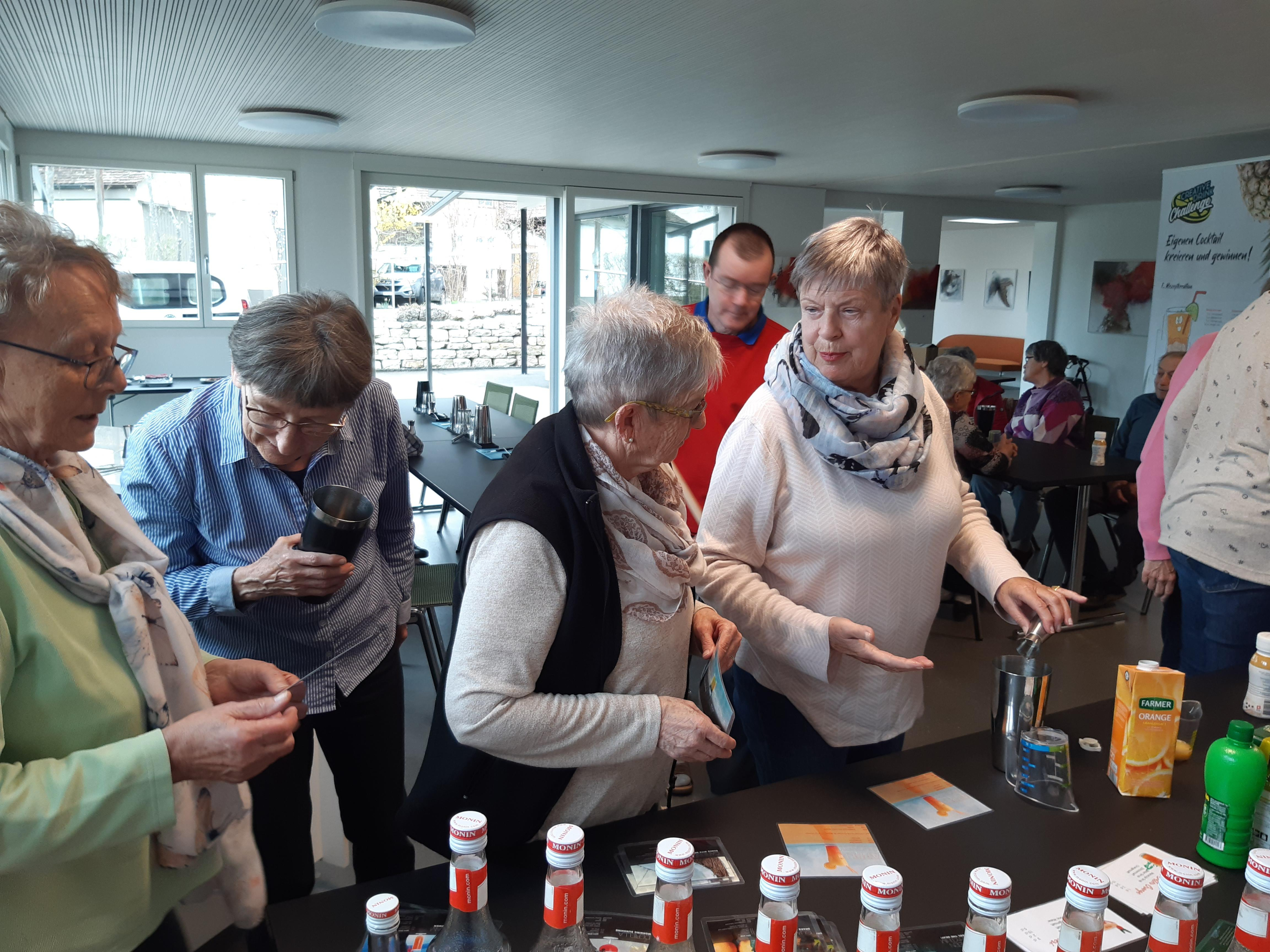 Unglaublich, was Markus Haubenschmid alles aufgebaut hatte! 16 Sirupsorten, Früchte, Eiswürfel, für alle einen Shaker… «Und man haut wirklich mit der Faust das Glas auf den Shaker??» Die Seniorinnen und Senioren studierten die Rezepte und schüttelten unter viel Gelächter ihre Drinks, bis diese schliesslich leuchtend orange bis giftgrün strahlend versucht werden konnten.