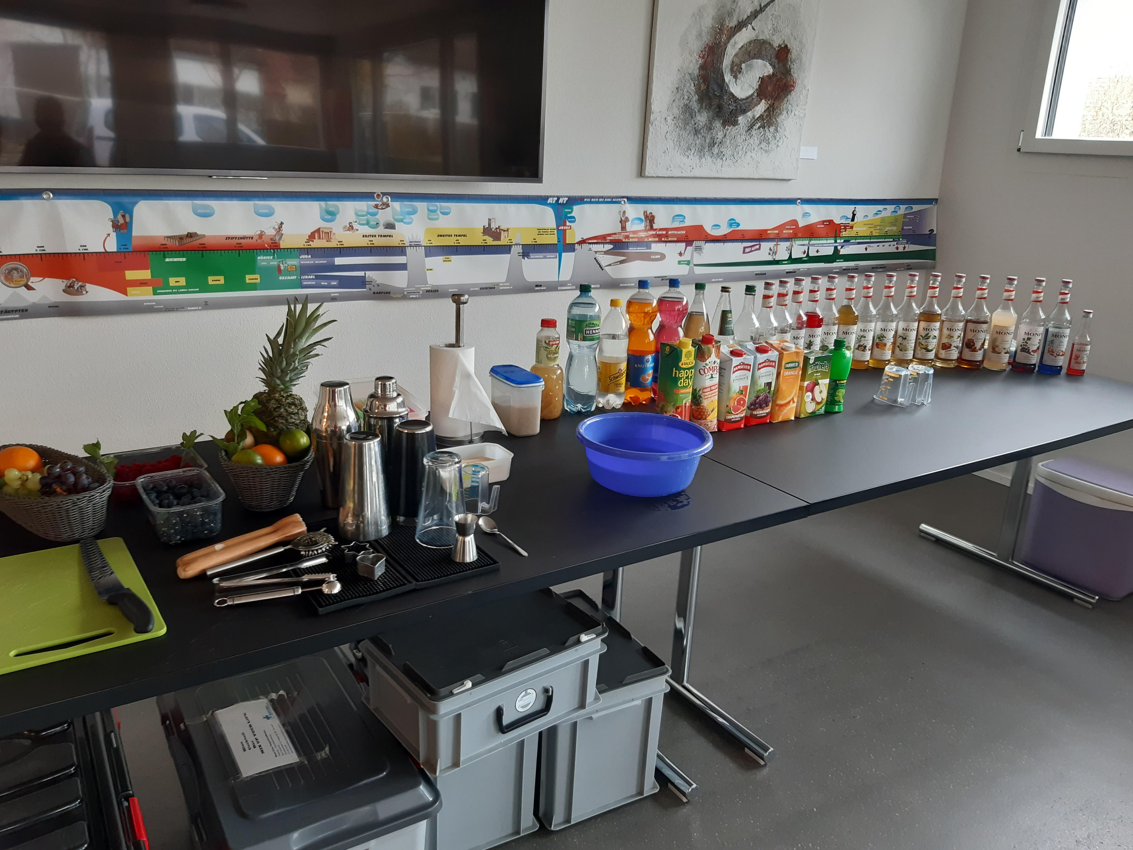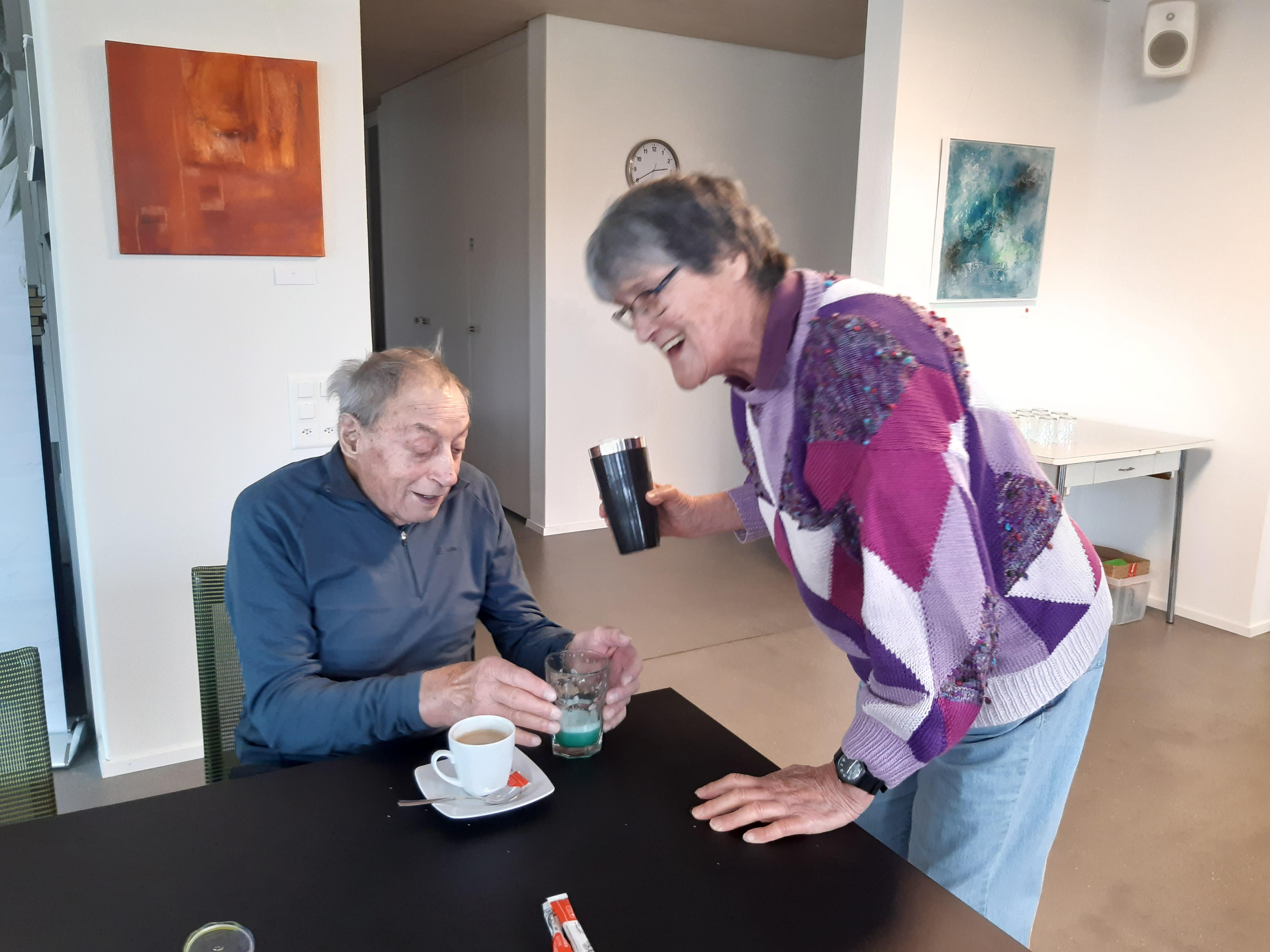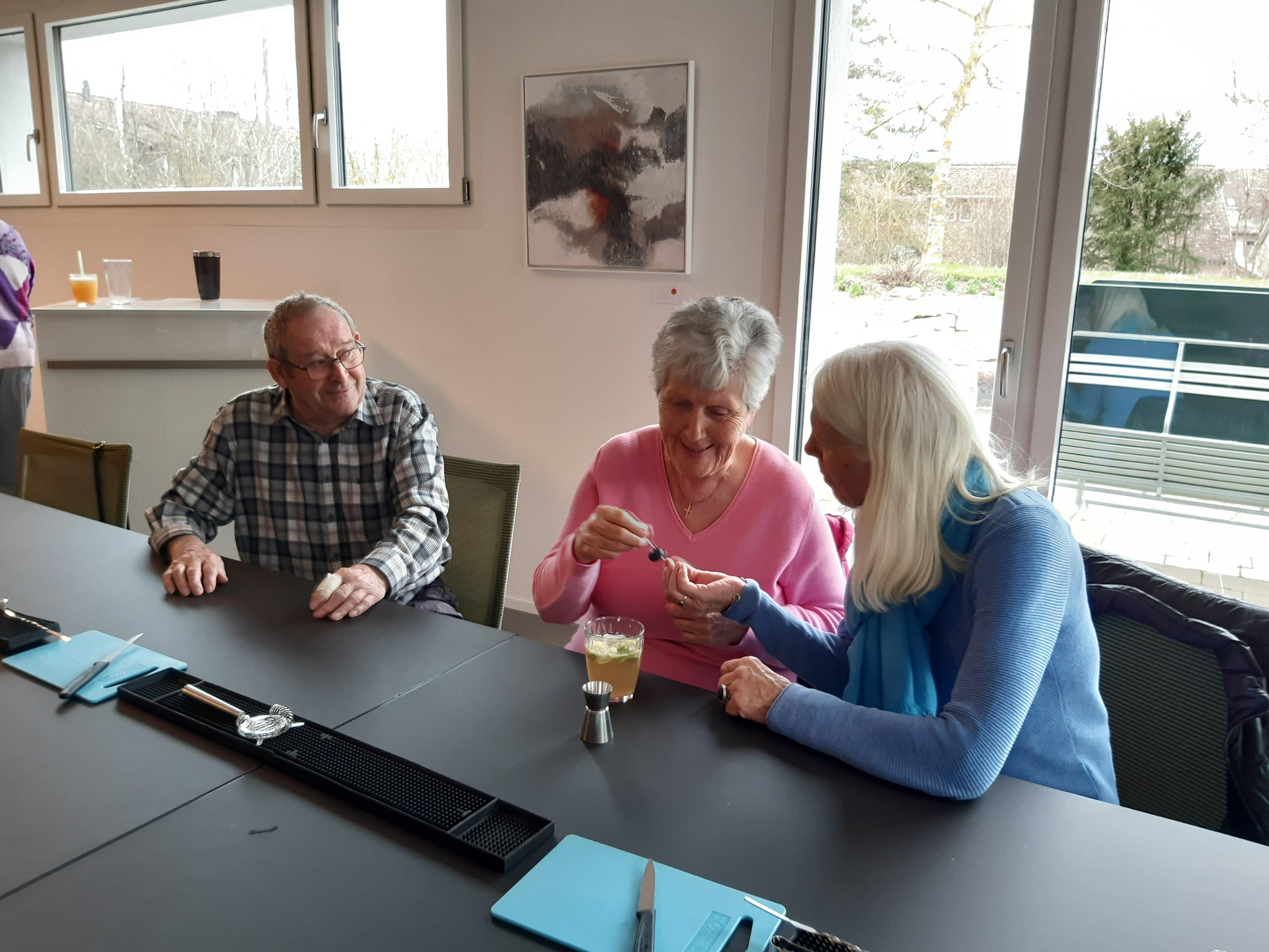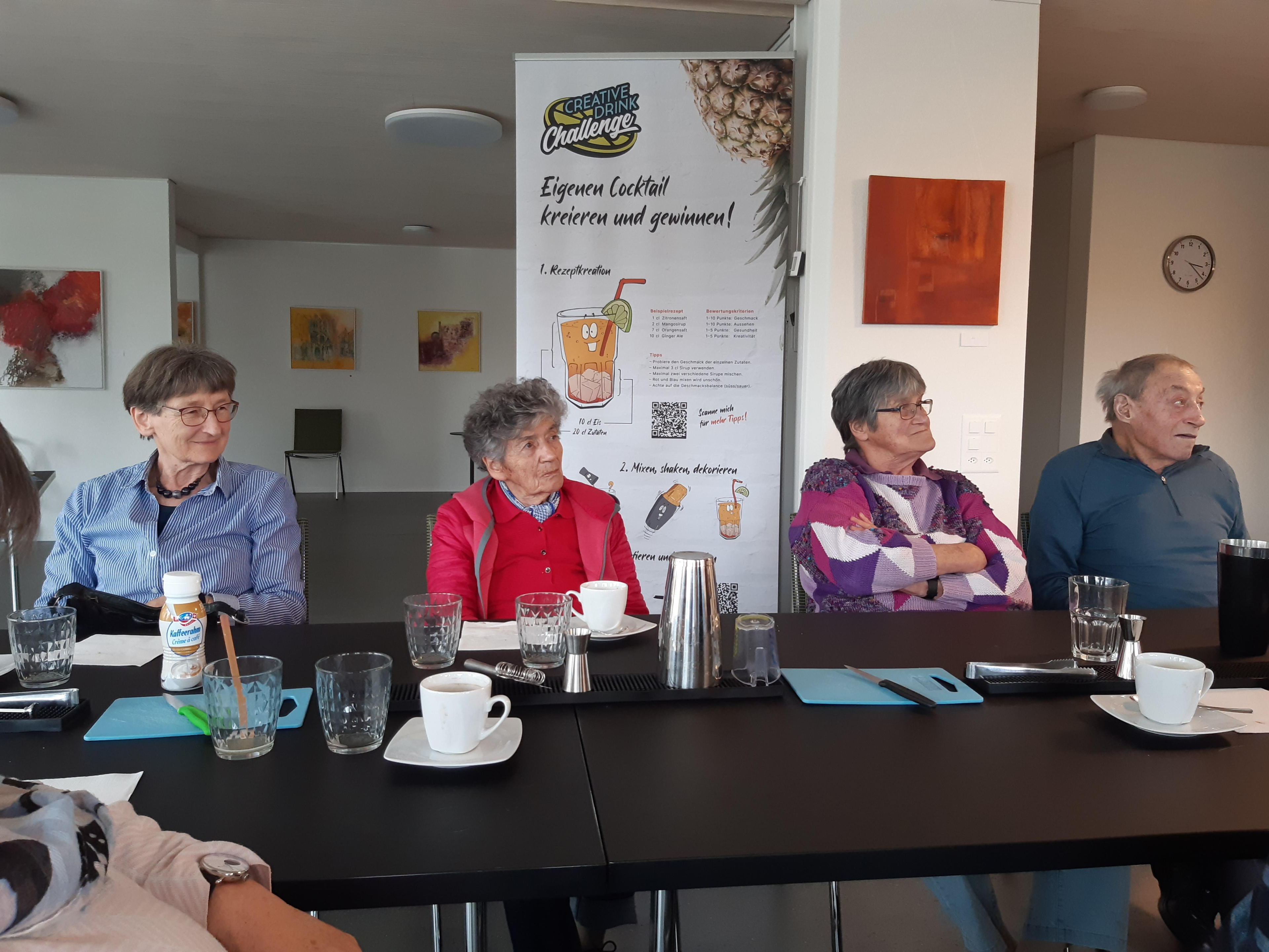 Unglaublich, was Markus Haubenschmid alles aufgebaut hatte! 16 Sirupsorten, Früchte, Eiswürfel, für alle einen Shaker… «Und man haut wirklich mit der Faust das Glas auf den Shaker??» Die Seniorinnen und Senioren studierten die Rezepte und schüttelten unter viel Gelächter ihre Drinks, bis diese schliesslich leuchtend orange bis giftgrün strahlend versucht werden konnten.
