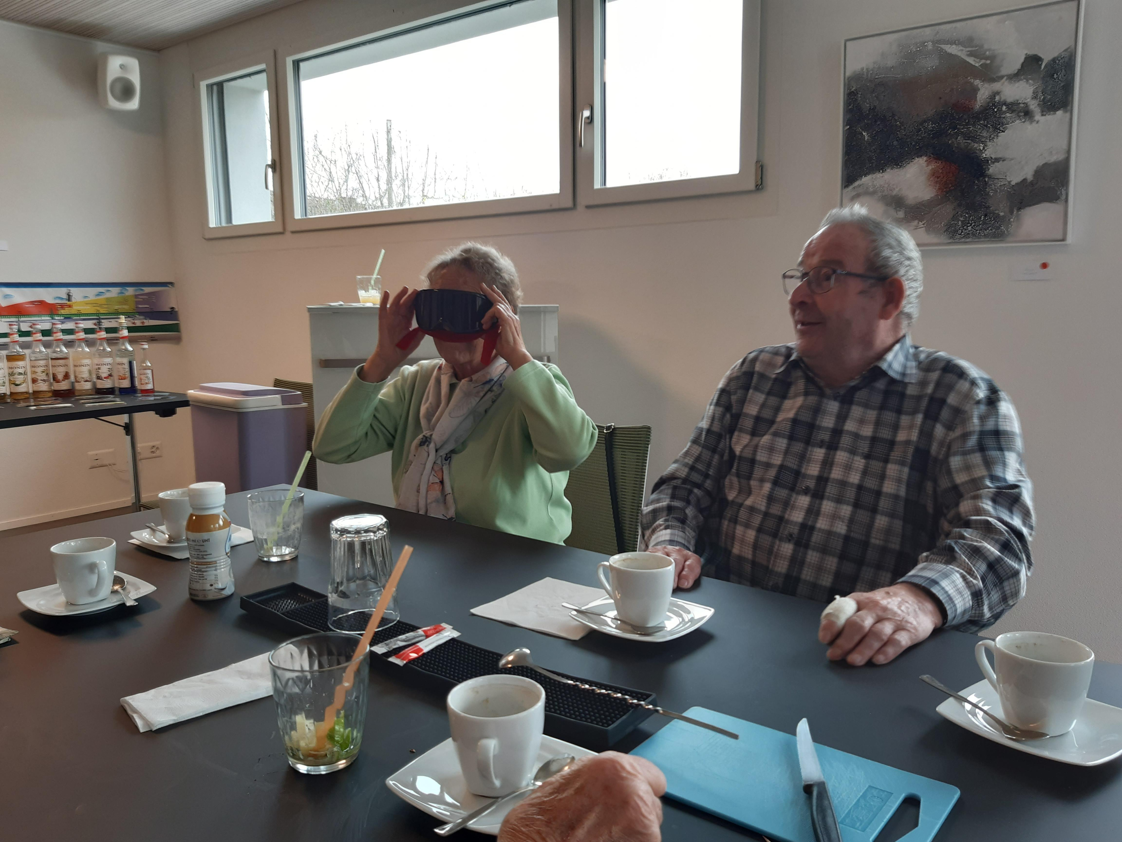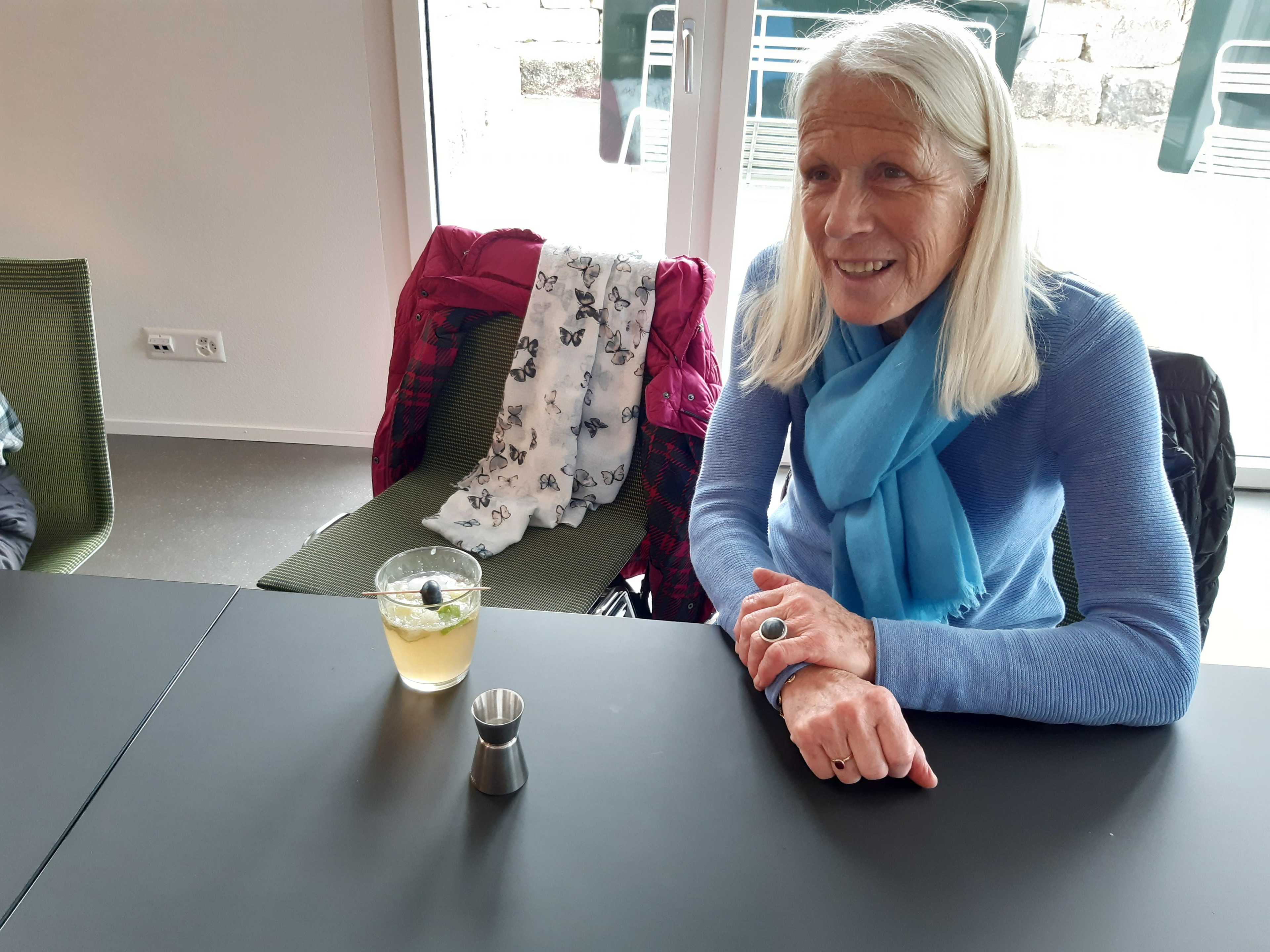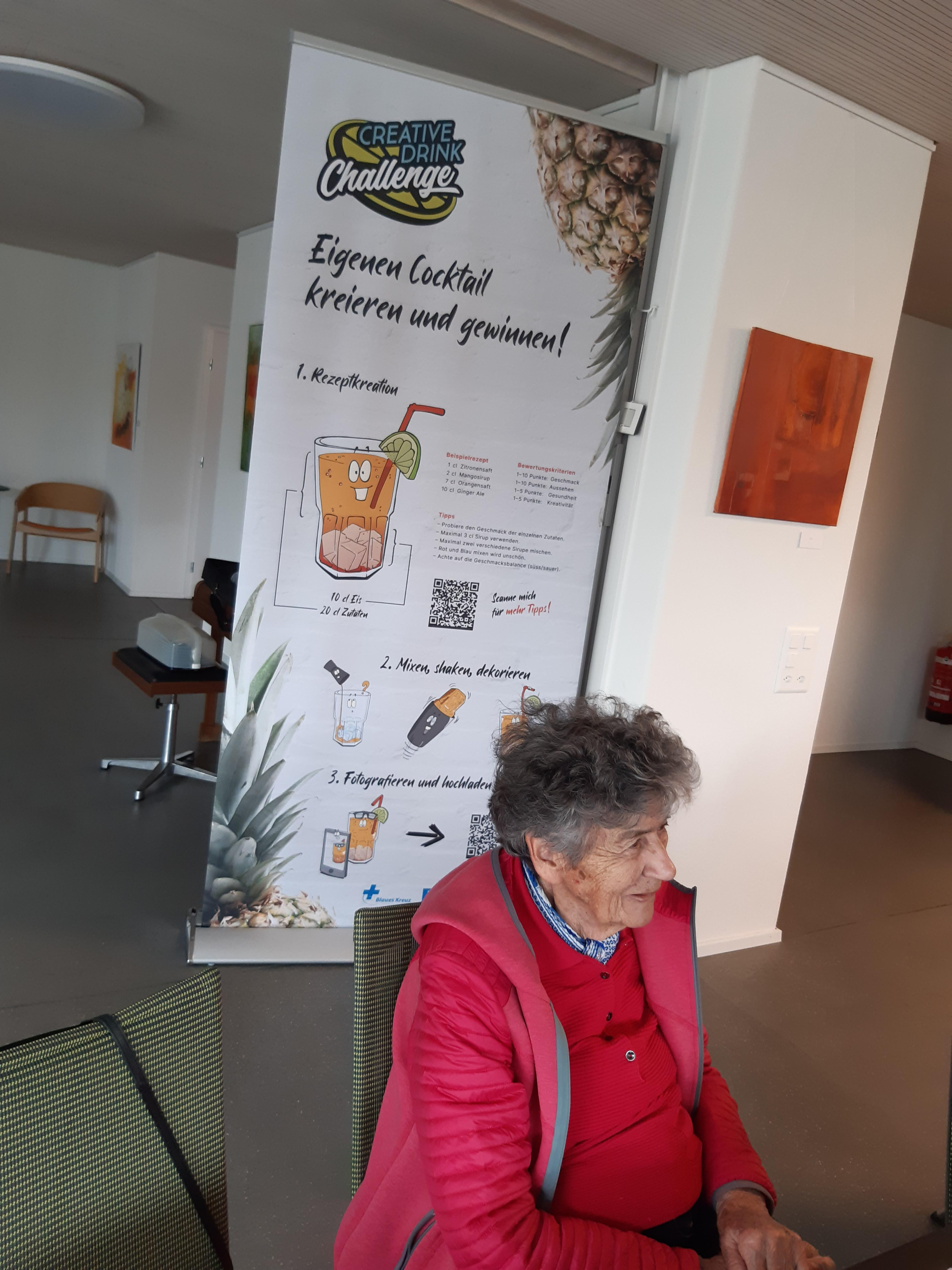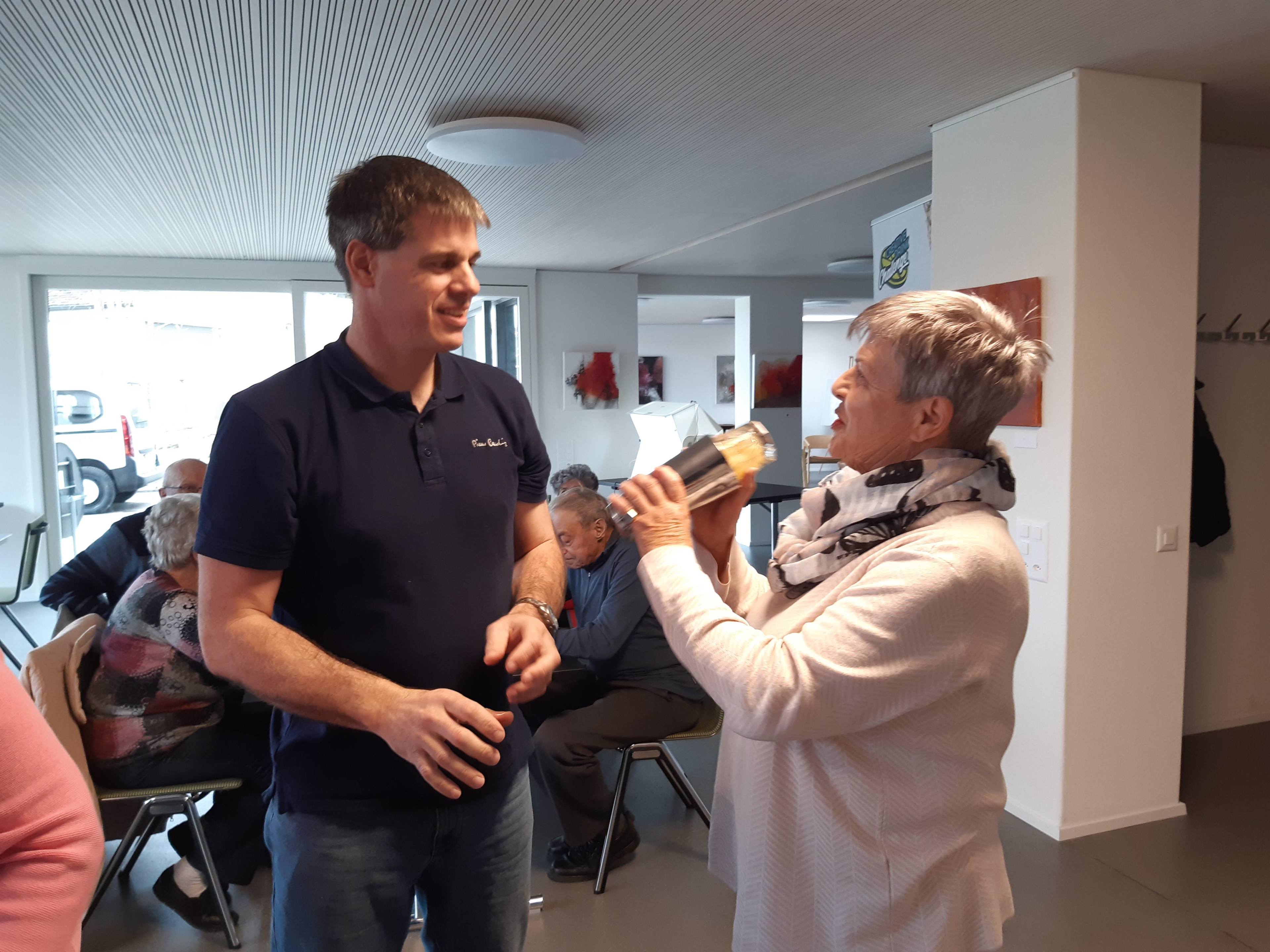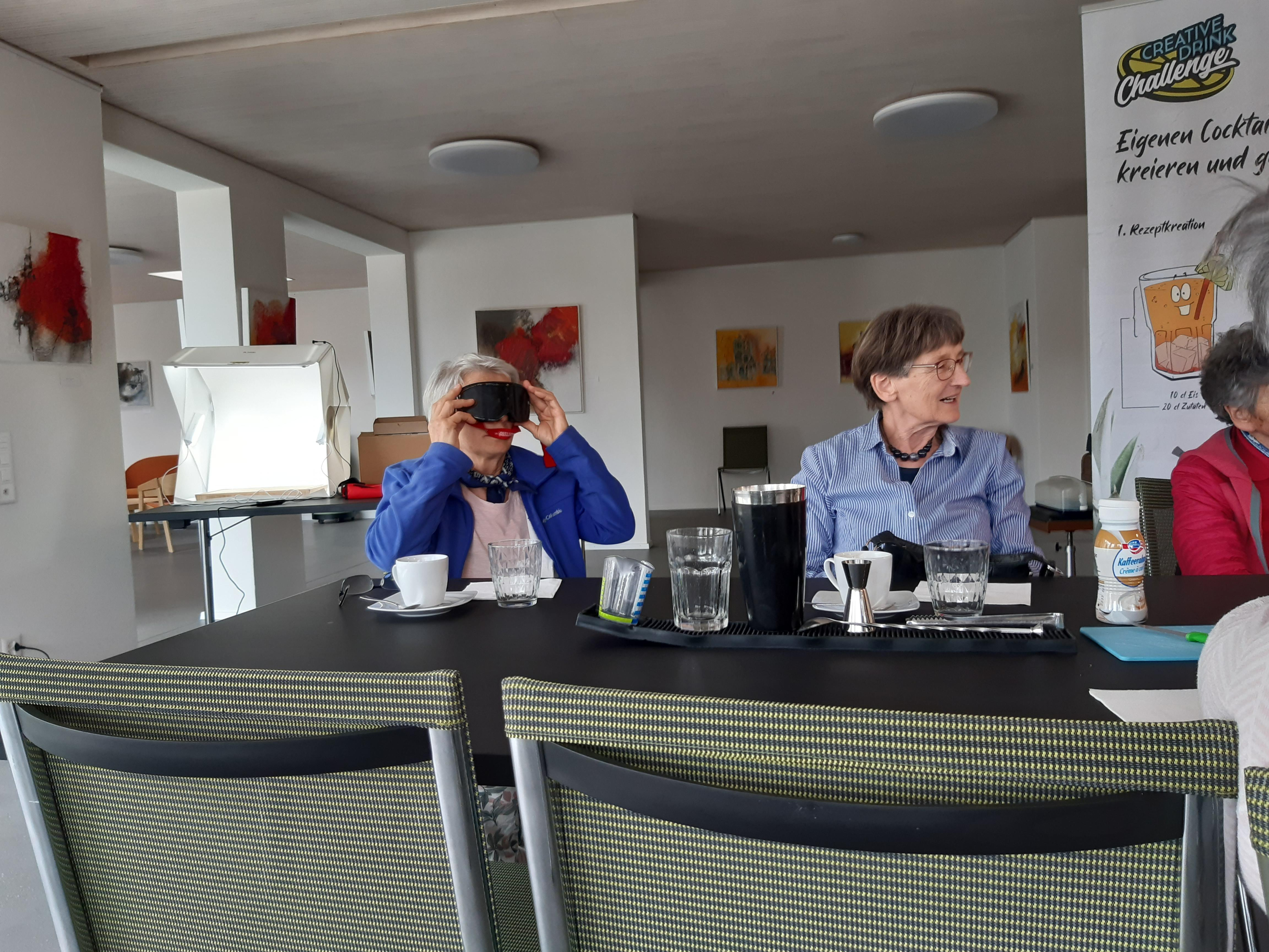 Unglaublich, was Markus Haubenschmid alles aufgebaut hatte! 16 Sirupsorten, Früchte, Eiswürfel, für alle einen Shaker… «Und man haut wirklich mit der Faust das Glas auf den Shaker??» Die Seniorinnen und Senioren studierten die Rezepte und schüttelten unter viel Gelächter ihre Drinks, bis diese schliesslich leuchtend orange bis giftgrün strahlend versucht werden konnten.