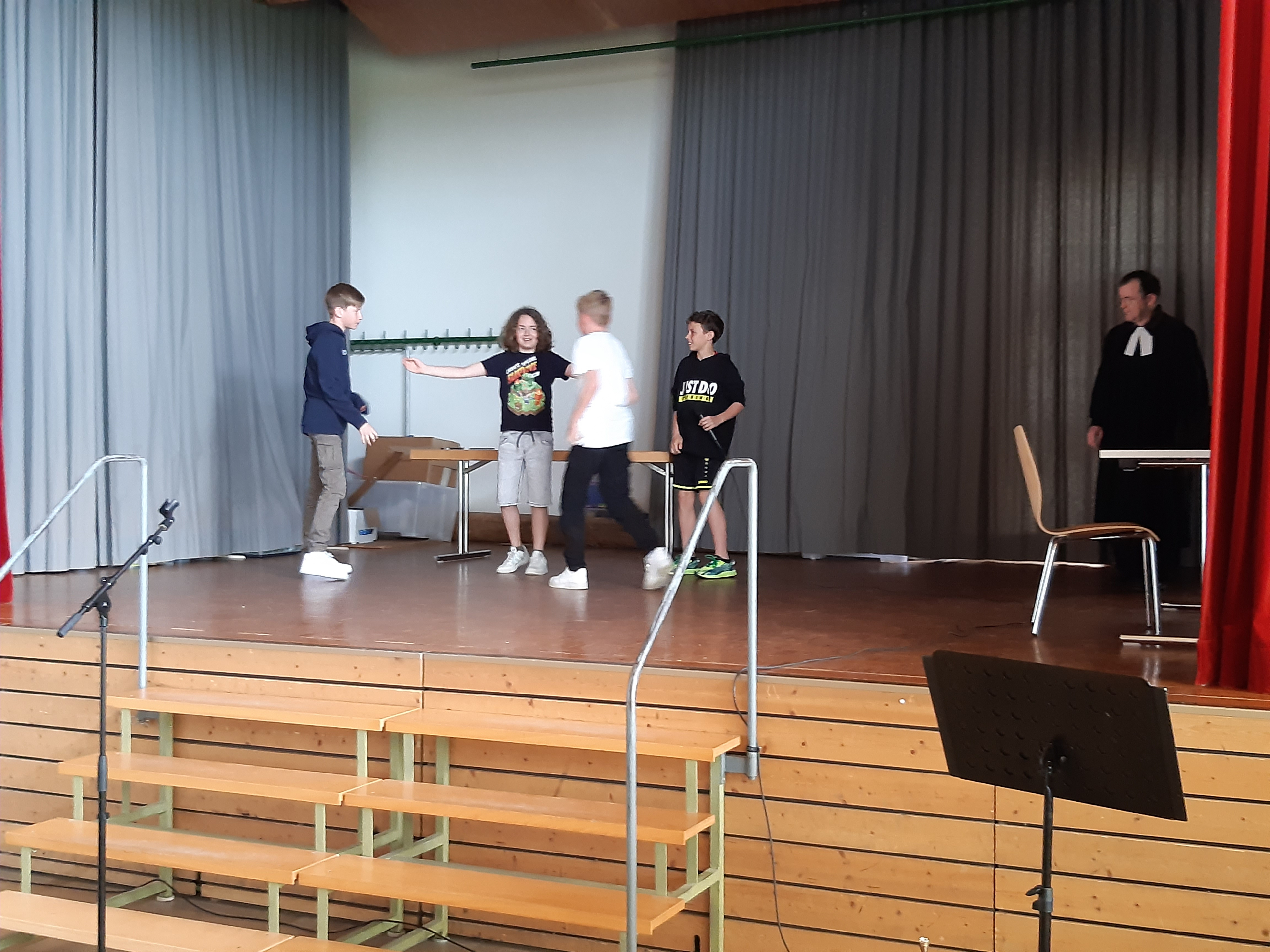 Schüler der 6. Klasse erfanden eine Aktualisierung: wie soll ein Lehrer reagieren, wenn es einen klaren Verstoss gegen die Schulregeln gibt? Mit Überzeugung spielten sie, wie einer einem anderen "einen Gehfehler gibt" und den anschliessenden Einsatz des Lehrers...