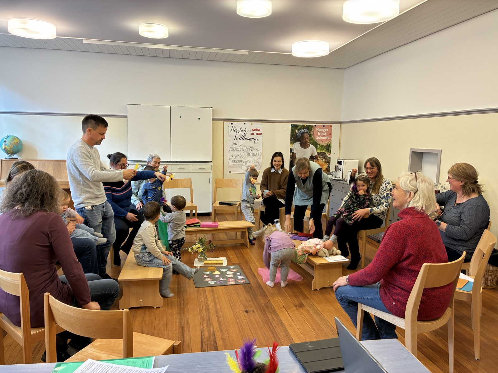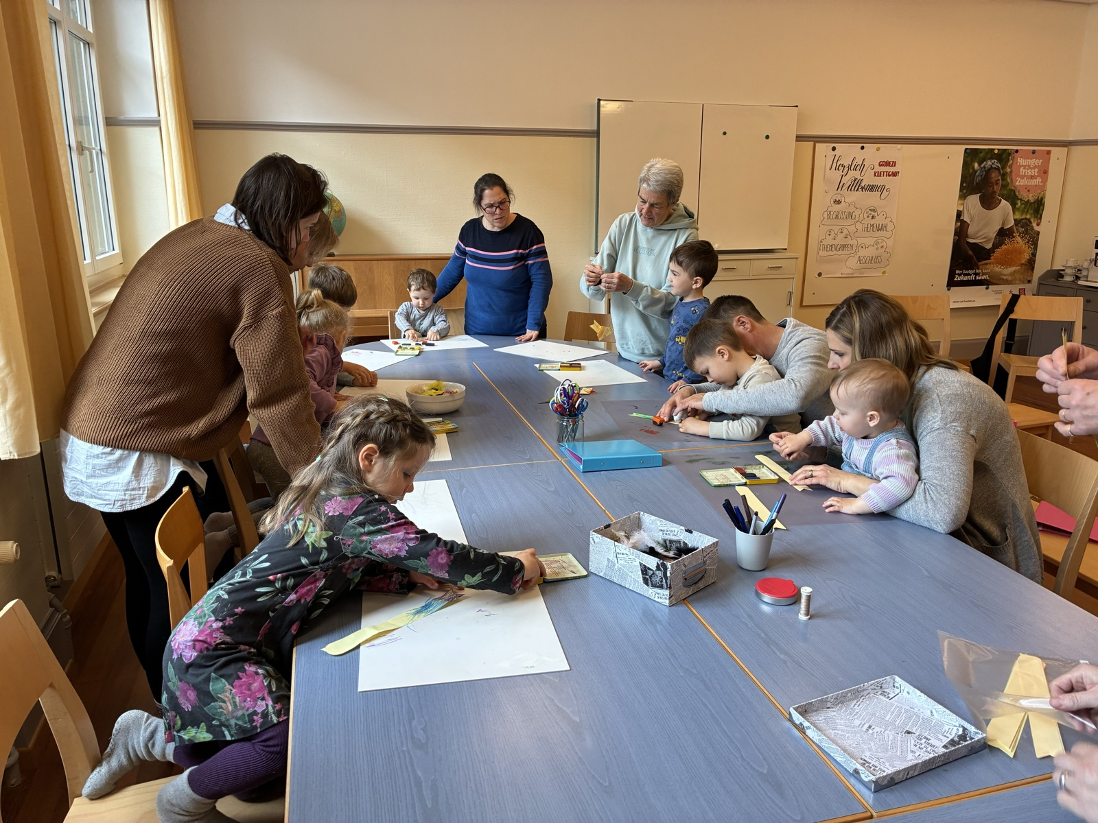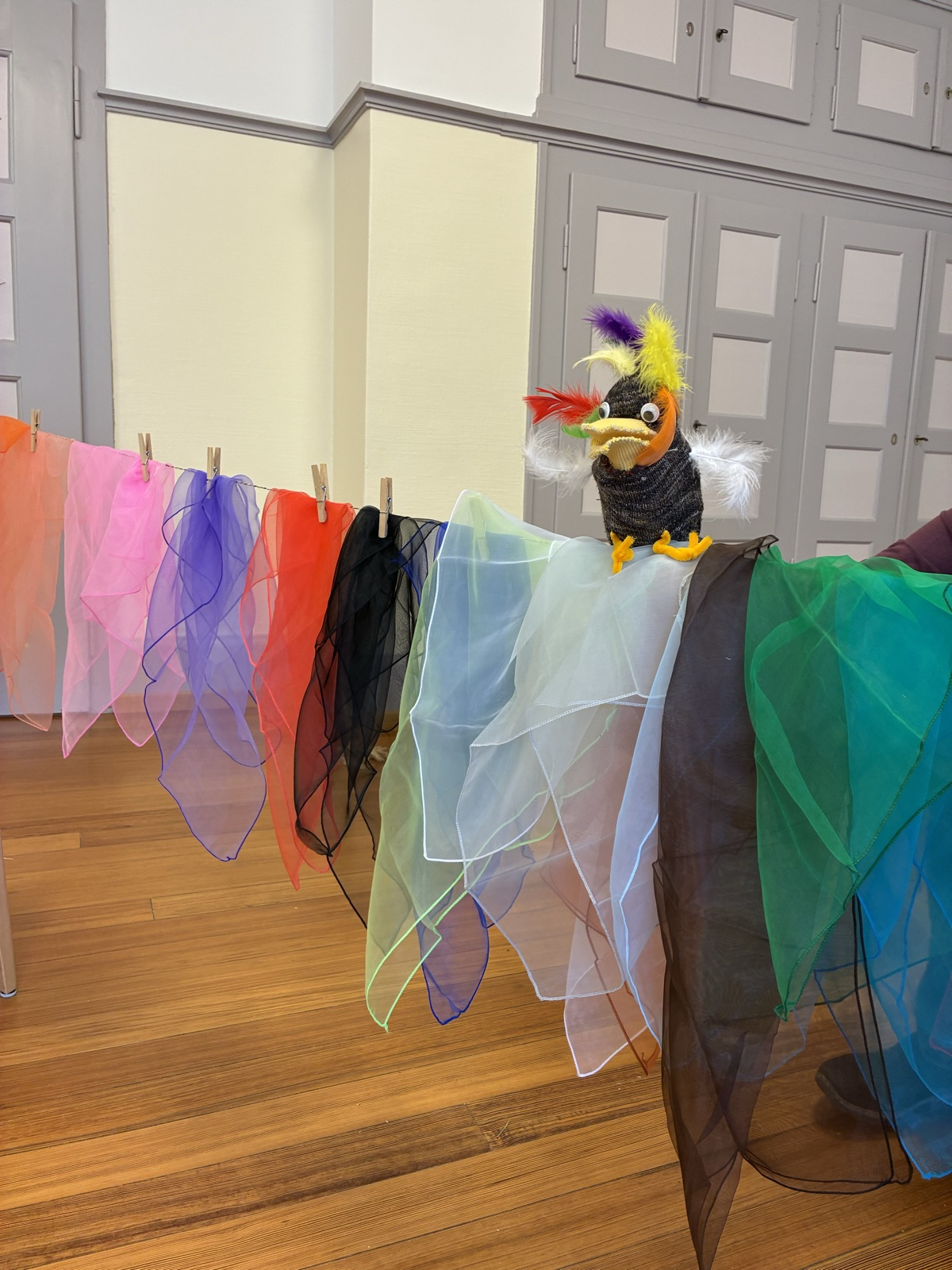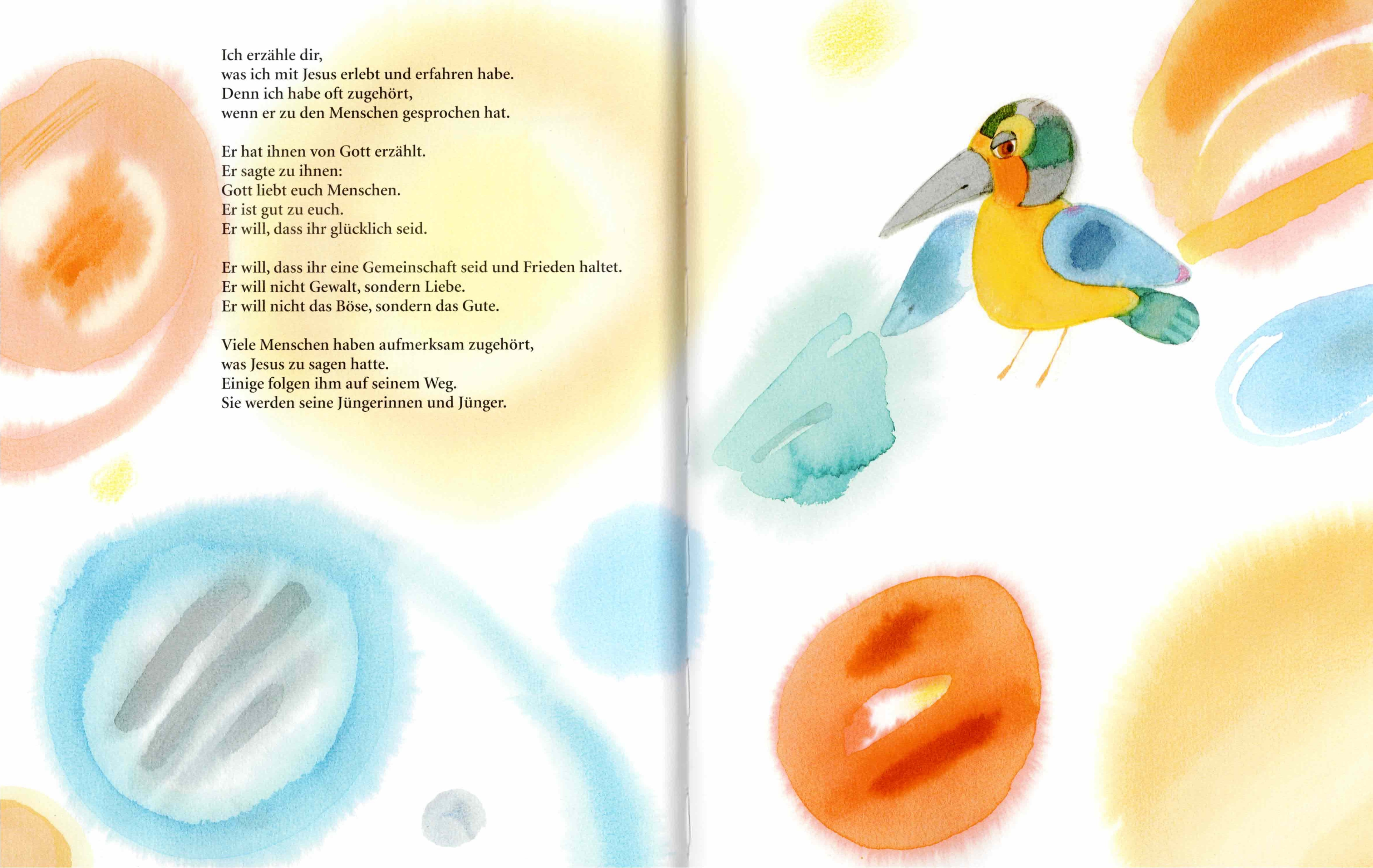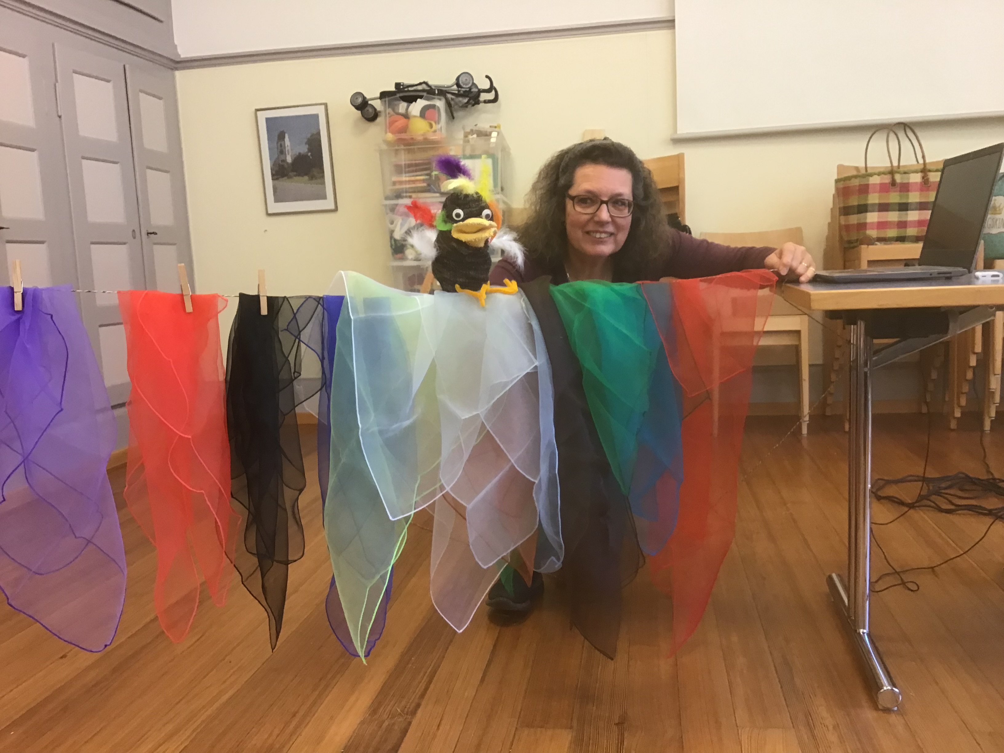 Und während die Passionsgeschichte in einfacher Form nach dem Bilderbuch von Hermann-Josef Frisch und Ivan Gantschev wiedergegeben wurde, wuchsen unserem Chamäleonvogel verschiedenfarbige Federn! Am Osterfest leuchteten sie schliesslich ganz besonders bunt.