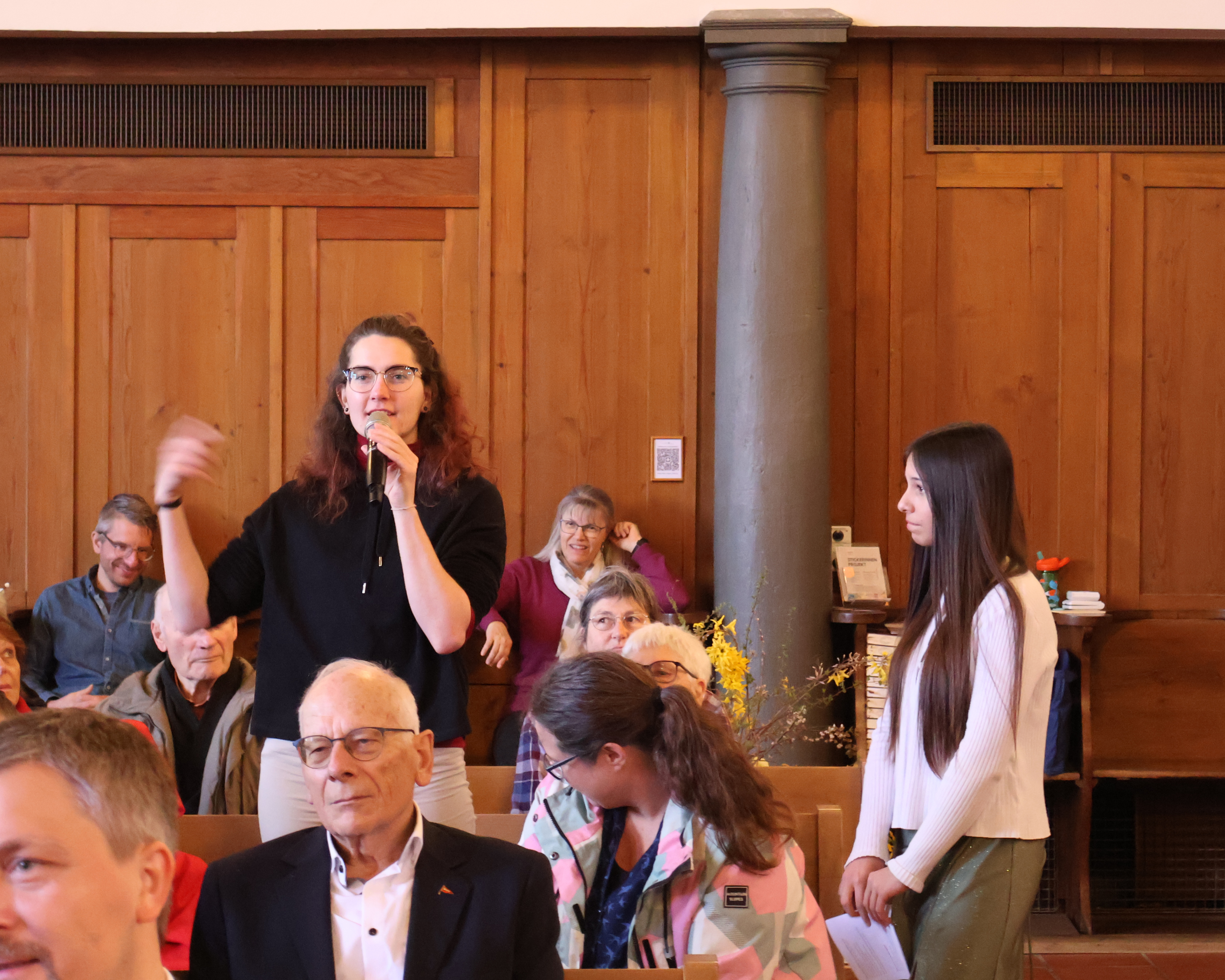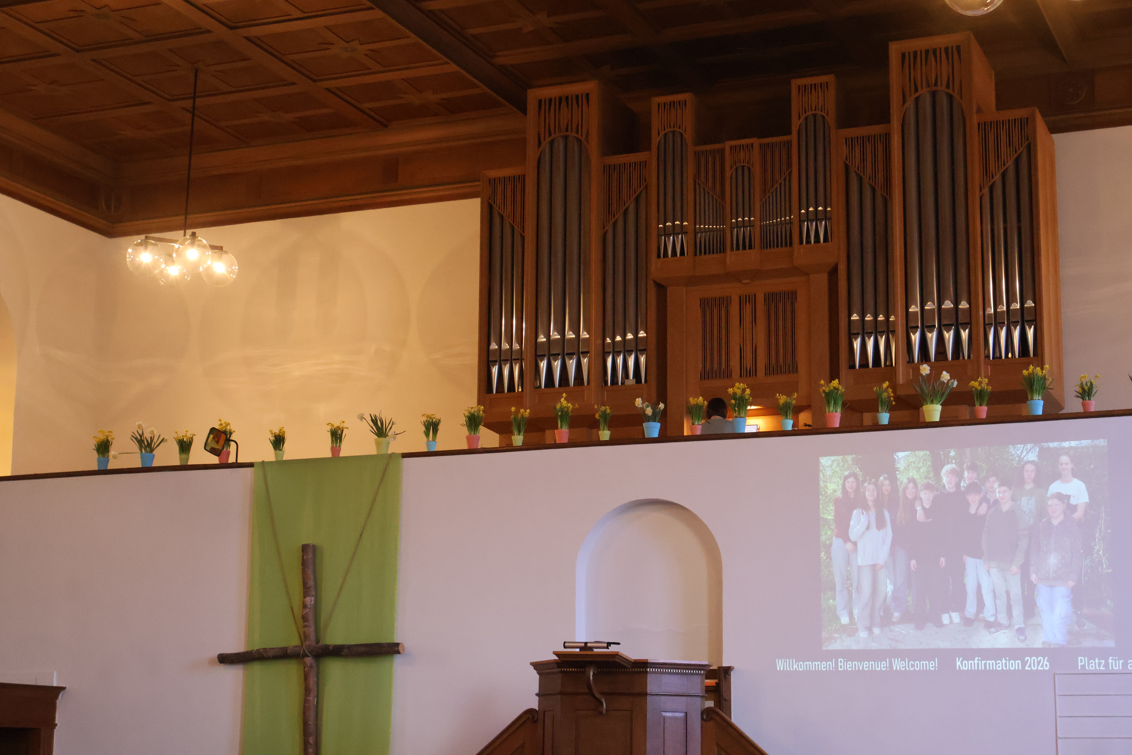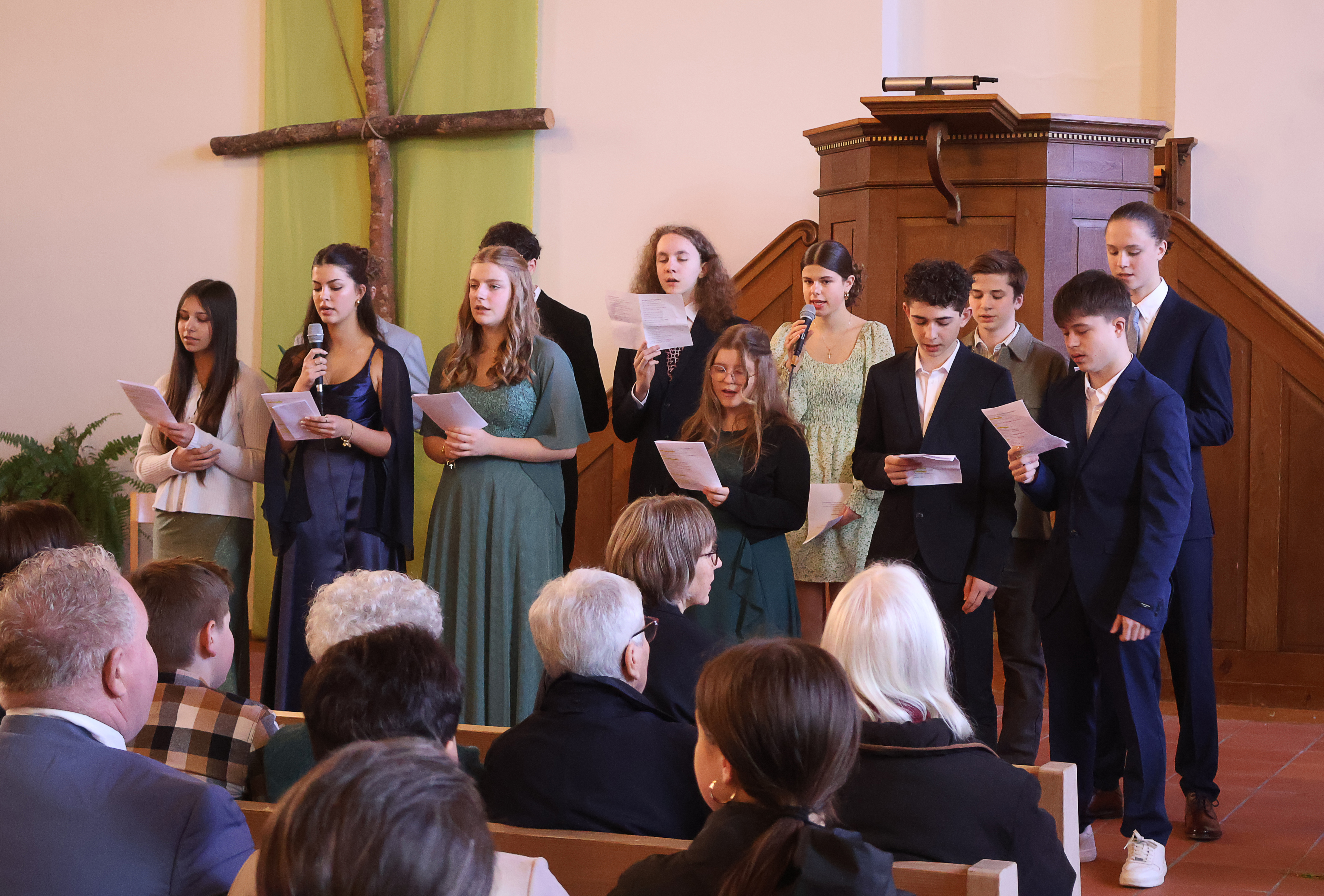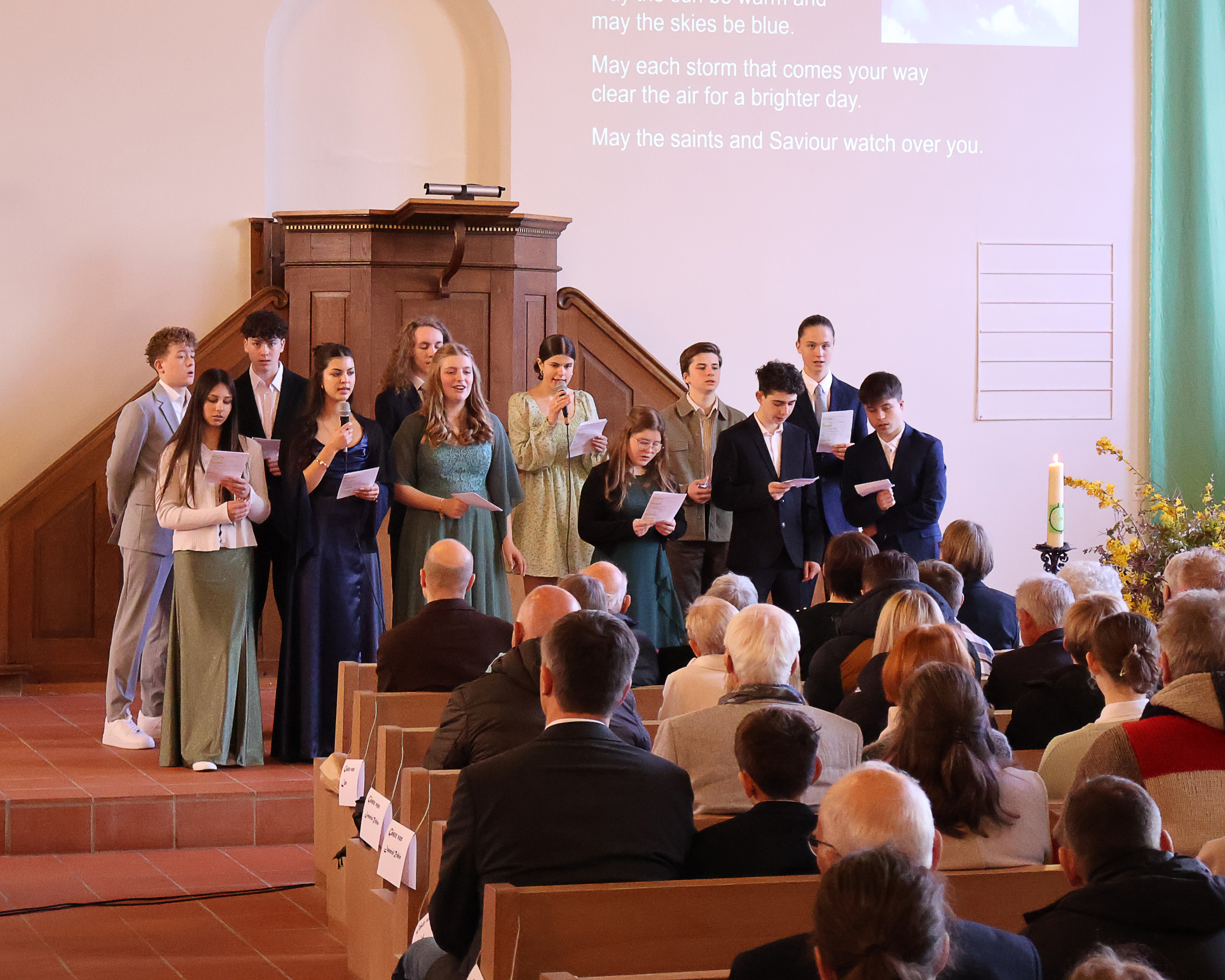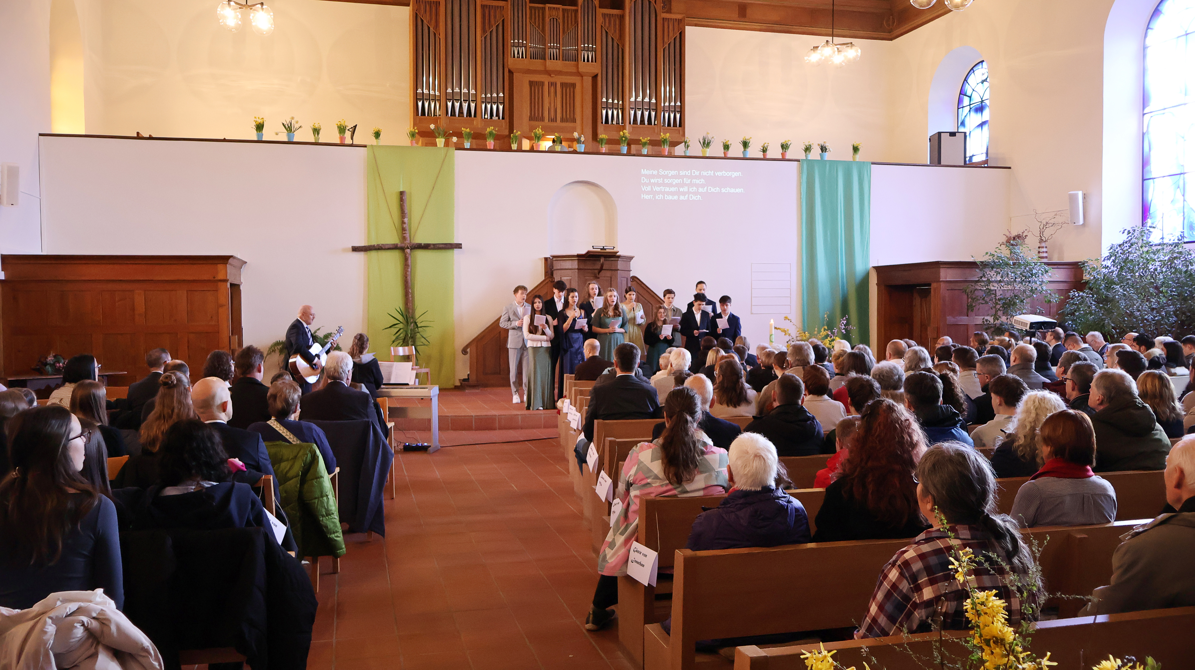 Alle Gäste der zwölf Konfirmandinnen und Konfirmanden fanden einen Platz in den Kirchenbänken. Die Frage, ob es auch in der Konf-Gruppe, auf dem Pausenhof oder in einer gemischten Gesellschaft Platz hat für alle, stellte sich im Lauf des abwechslungsreichen Gottesdienstes immer wieder. Die Jugendlichen moderierten ihre Feier, spielten gemeinsam eine Szene, sangen passende Lieder und stellten sich in einem Video vor.