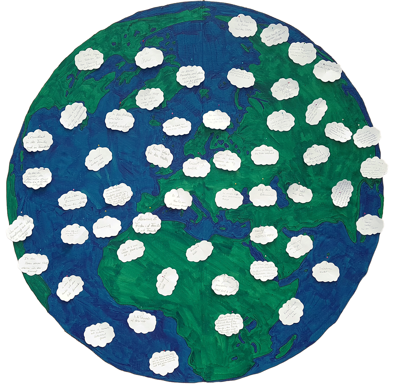 «Himmel auf Erden!» Wo erfahrt Ihr ein Stückchen Himmel auf Erden? Wo erlebt Ihr etwas von der Gegenwart, vom Wirken des dreieinigen Gottes? Vielleicht nur andeutungsweise, vielleicht deutlich. So fragte ich in einem Gottesdienst und lud ein, etwas dazu auf eine weisse Wolke zu schreiben. Die beschrifteten Wolken steckten wir dann an die Weltkugel.