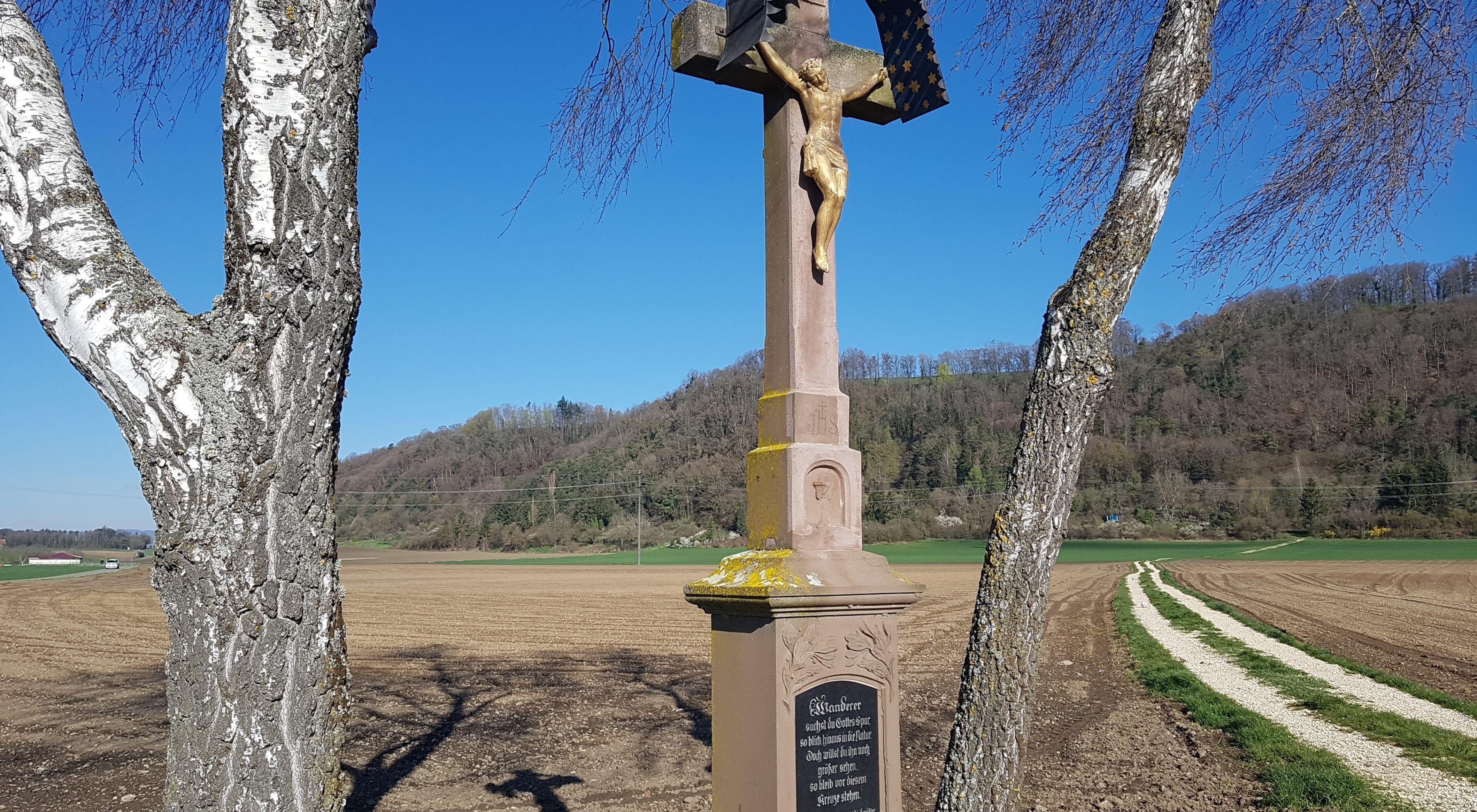 Im übertragenen Sinn sind wir alle Wanderer, Pilger. Darum haben die Worte auf diesem Wegkreuz in Rielasingen so oder so Bedeutung für uns: «Wanderer, suchst du Gottes Spur, so blick hinaus in die Natur. Doch willst du ihn noch grösser sehen, so bleib vor diesem Kreuze stehen."